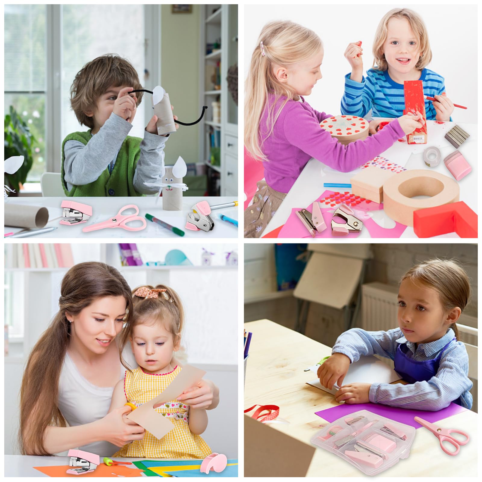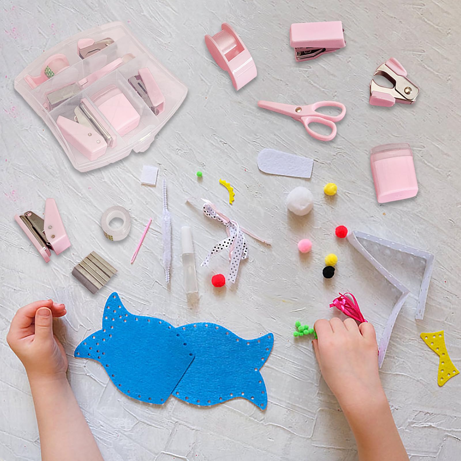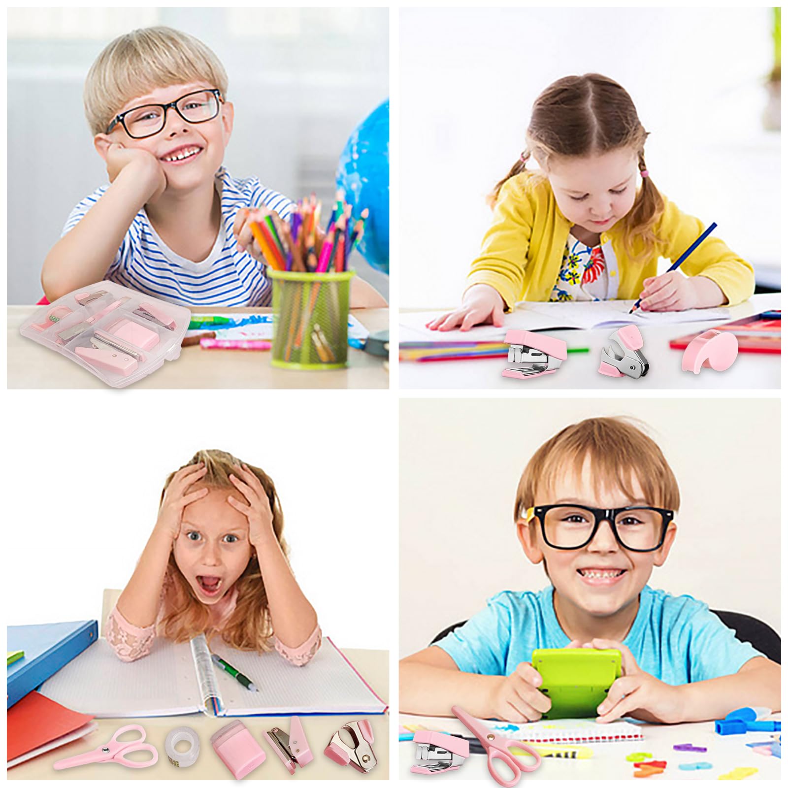 Mini Desktop Staples Set: This set includes a mini stapler, a hole punch, a tape, a roll of tape, a mini scissors, a pencil sharpener, and two staples to meet the needs of daily binding paper and is designed for use in the office, home, or classroom.