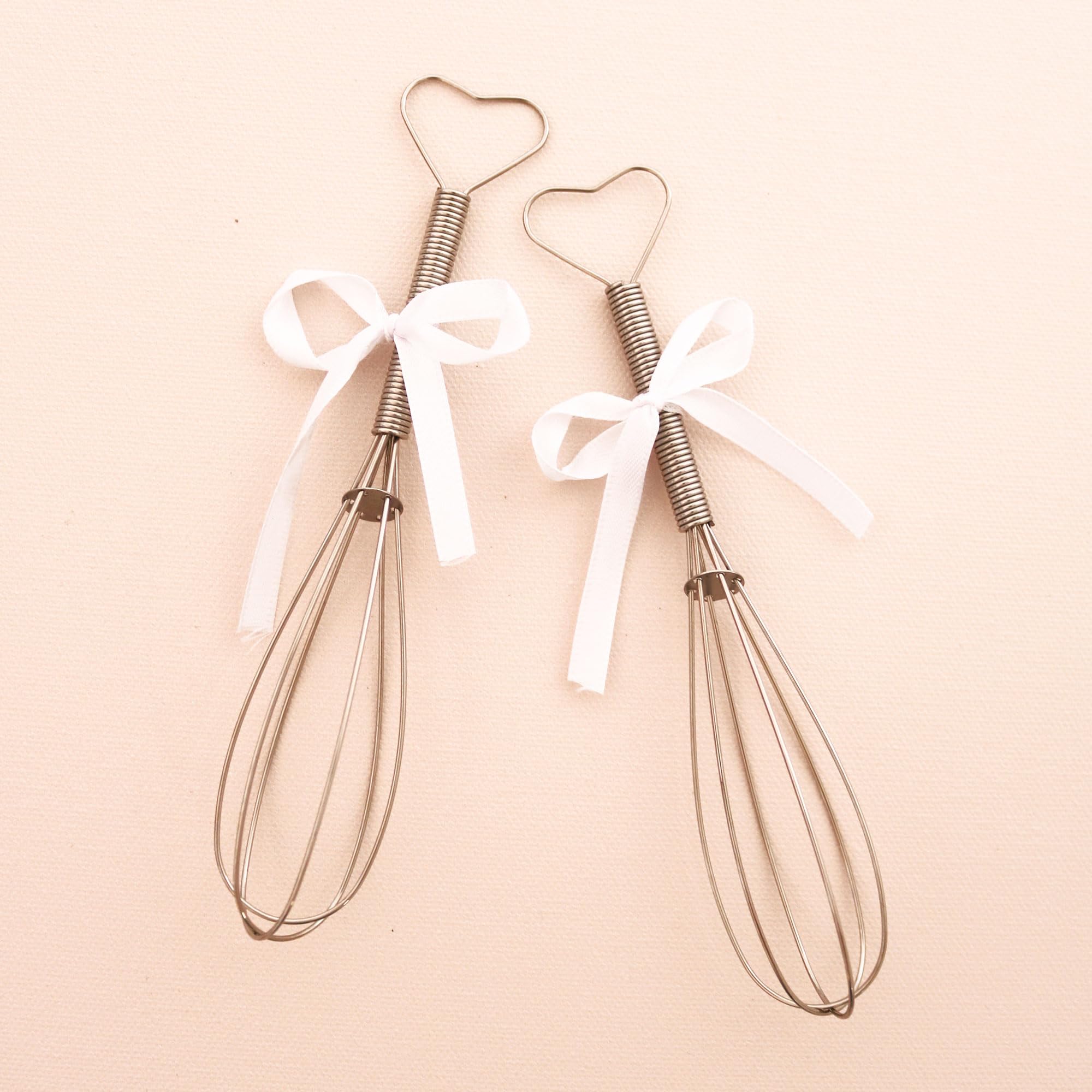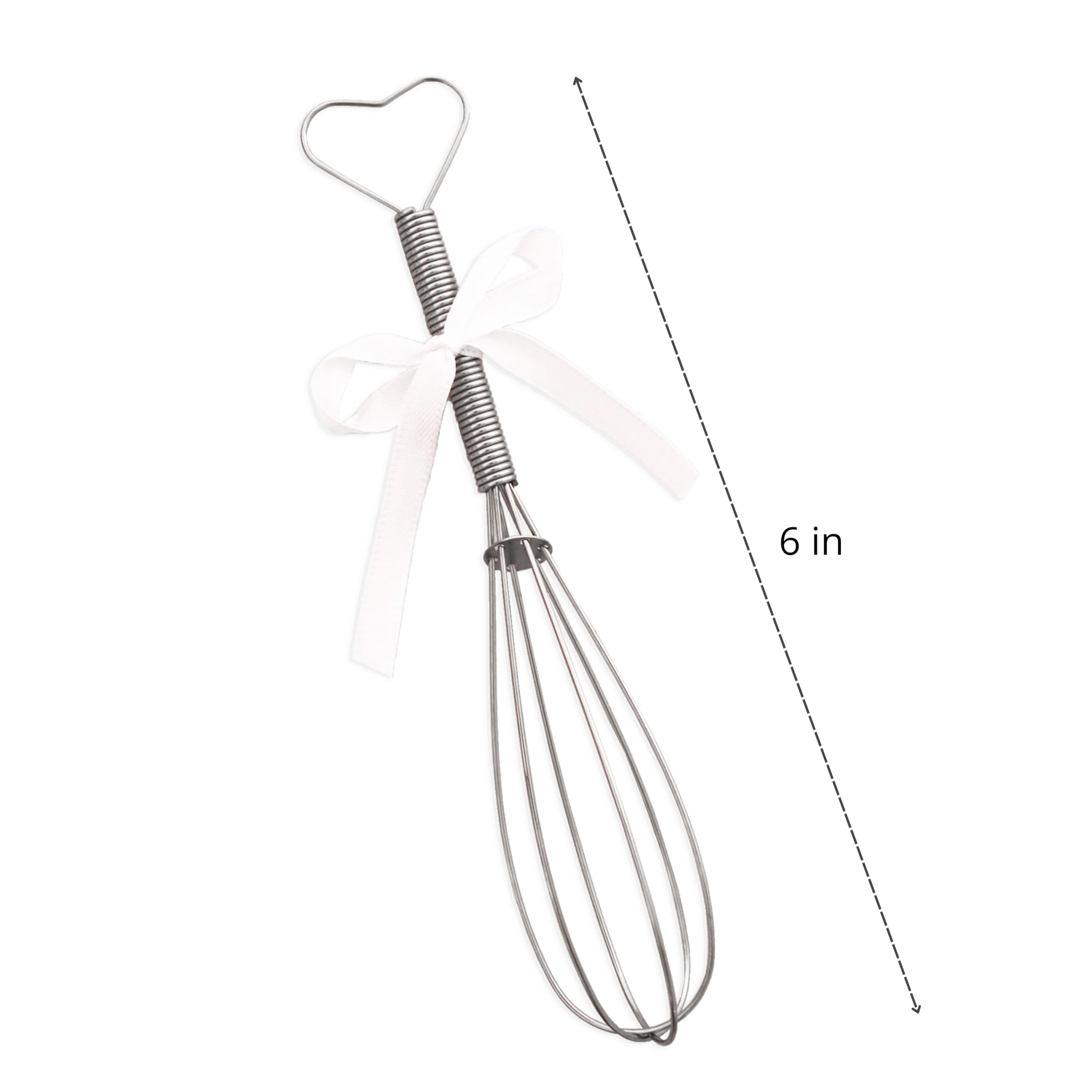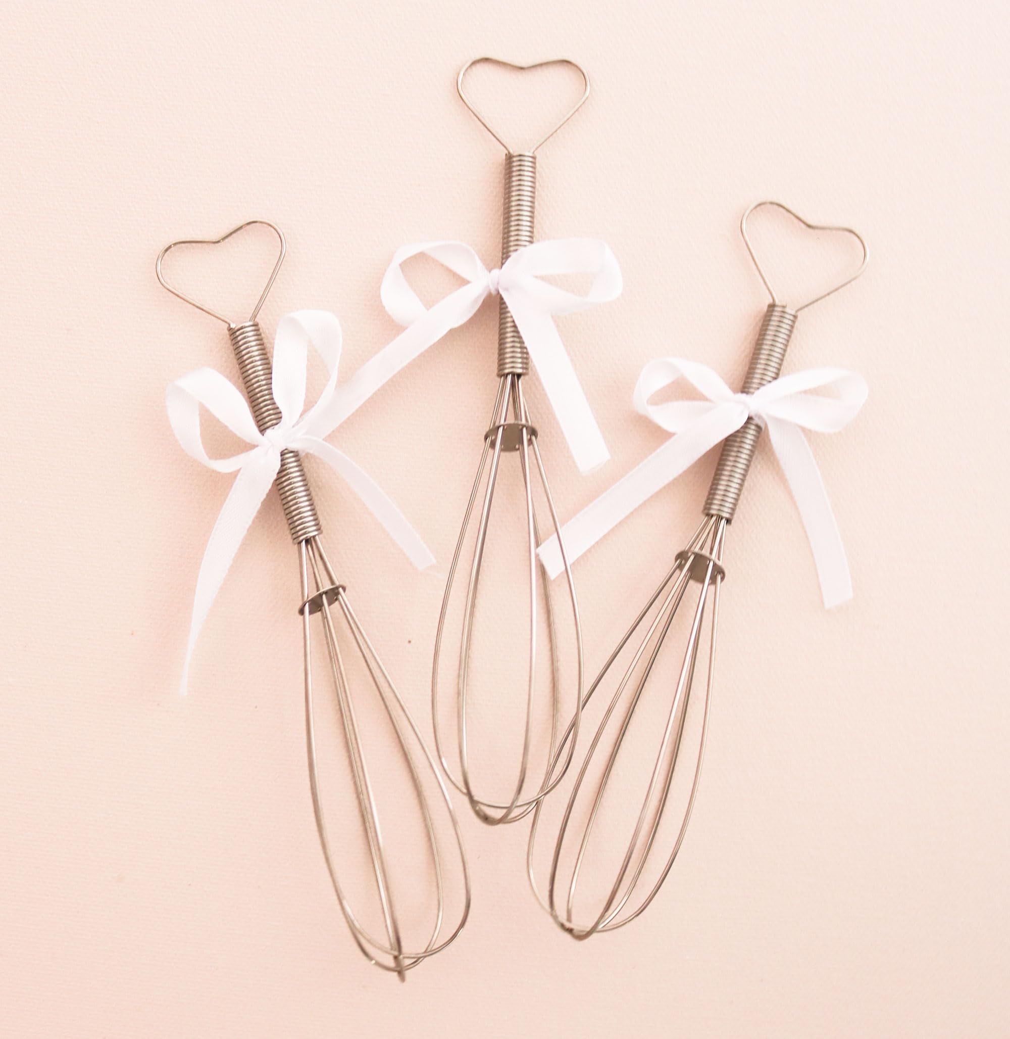 - MINI WHISKS: These mini whisks are an adorable favor for your next event! Each order comes with a SET OF 12 metal wire whisks with a heart-shaped handle and white ribbon attached.