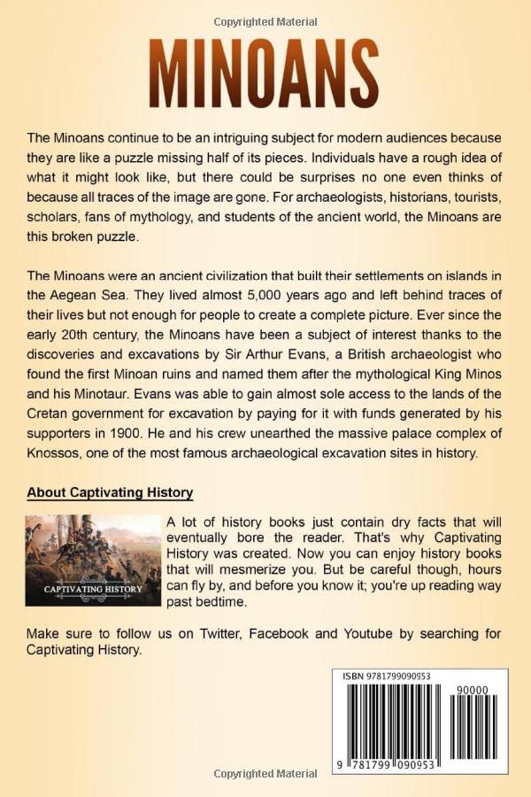 If you want to discover the captivating history of the Minoans, then keep reading… The Minoans continue to be an intriguing subject for modern audiences because they are like a puzzle missing half of its pieces. Individuals have a rough idea of what it might look like, but there could be surprises no one even thinks of because all traces of the image are gone. For archaeologists, historians, tourists, scholars, fans of mythology, and students of the ancient world, the Minoans are this broken puzzle. The Minoans were an ancient civilization that built their settlements on islands in the Aegean Sea. They lived almost 5,000 years ago and left behind traces of their lives but not enough for people to create a complete picture. Ever since the early 20th century, the Minoans have been a subject of interest thanks to the discoveries and excavations by Sir Arthur Evans, a British archaeologist who found the first Minoan ruins and named them after the mythological King Minos and his Minotaur. Evans was able to gain almost sole access to the lands of the Cretan government for excavation by paying for it with funds generated by his supporters in 1900. He and his crew unearthed the massive palace complex of Knossos, one of the most famous archaeological excavation sites in history. From the work of Evans and others, the puzzle of the Minoans has slowly gained more pieces. Through the study of material culture, modern audiences now know quite a bit about artistic techniques, favorite subjects, fashion, daily life, gender roles, and who the Minoans traded with. An observer can tell that the Minoans were a seafaring mercantile civilization, that they built magnificent urban centers, and that they had a form of proto-writing. In Minoans: A Captivating Guide to an Essential Bronze Age Society in Ancient Greece Called the Minoan Civilization, you will discover topics such as: Where and When Did the Minoans Live? Known History of the Minoans before the Mycenaeans Society, Culture, and Daily Life Trade and Shipbuilding on the Mediterranean Sea Language and Linear A The Potential Predecessors of Greek Religion Art Architecture Theories about the Collapse of Civilization And much, much more! So if you want to learn more about the Minoans, scroll up and click the “add to cart” button!