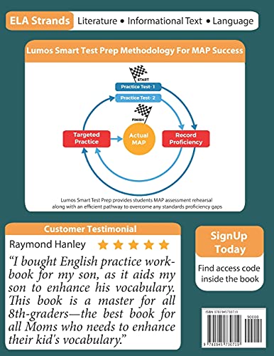 Missouri Assessment Program (MAP) 8th Grade English Language Arts Workbook for Kids (Ages 13-14) updated for 2023-24. Boost your child’s MAP test scores using the Lumos Grade 8 English Language Arts Test Prep Workbook. Crafted by expert educators, this workbook comprehensively covers over 40+ essential ELA skills tailored for eighth graders. Featuring a wide variety of standards-aligned practice questions, the Lumos MAP workbook supports your child to enhance ELA proficiency through consistent daily and weekly practice, resulting in improved MAP test scores. Why You’ll Love This 8th Grade English Book for 2023-24 MAP Test Prep Excel in 40+ Essential ELA Skills: Master key ELA concepts including Reading: Literature, Reading: Informational Text, and Language. This comprehensive workbook fosters not just success in the Missouri State assessment, but also cultivates a robust academic groundwork. Boost State Test Success: Lumos MAP test prep workbooks break free from traditional print workbooks. It features a wide variety of standards-aligned content in both print and online formats. Lumos Smart Test Prep Methodology: Unlock success on the Missouri State test (MAP) powered by our proprietary Lumos Smart Test Prep Methodology. It provides simulated MAP practice and remediation tools to overcome proficiency gaps. Replicated MAP Practice: Access 2 full-length online practice tests mirroring the MAP blueprint–question types, tech-enhanced items, duration, rigor of the standards, and more. Plus, the look and feel are the same as the actual MAP computerized test, fostering comfort with the MAP format, and boosting test readiness. Important Note: Once you register for the online program, the first practice test gets auto-assigned by Lumos Support. Personalized Study Plan for Targeted Remediation: Using your child’s performance data from the online MAP-like practice tests, the online program generates a personalized study plan. This plan includes a checklist of standards tailored to your child’s needs, guiding them to improve with relevant practice questions from our workbook and online program. Track Your Child’s Progress and Growth: Gain valuable insights with an intuitive dashboard in the online program to monitor advancement and pinpoint strong and weak areas. About Lumos Learning Lumos Learning has been a trusted partner in providing state test preparation resources to parents and educators for over 16 years. With an impressive reach of over 1 million students, 125,000 teachers, and 44,000 schools, our proven study programs improve student outcomes in state assessments. Versatile and Flexible Learning Solution At-Home Learning Classroom Learning Home Tutoring & Home Schooling. Resources in the Print Workbook 3 chapters covering 40+ ELA skills Answer keys with detailed explanations Resources in the Online Program 2 full-length practice tests mirroring the MAP blueprint Personalized study plan for targeted remediation Supplementary resources: solved examples, videos, and more User-friendly dashboard and performance reports for progress measurement Access MAP Online Resources in 3 Easy Steps Scan the QR code or visit www.lumoslearning.com/a/tedbooks Enter the access code provided within the print workbook Provide basic details and get started! Grab your copy of the Lumos MAP 8th-grade English Language Arts workbook today and boost your child’s Missouri State test scores!