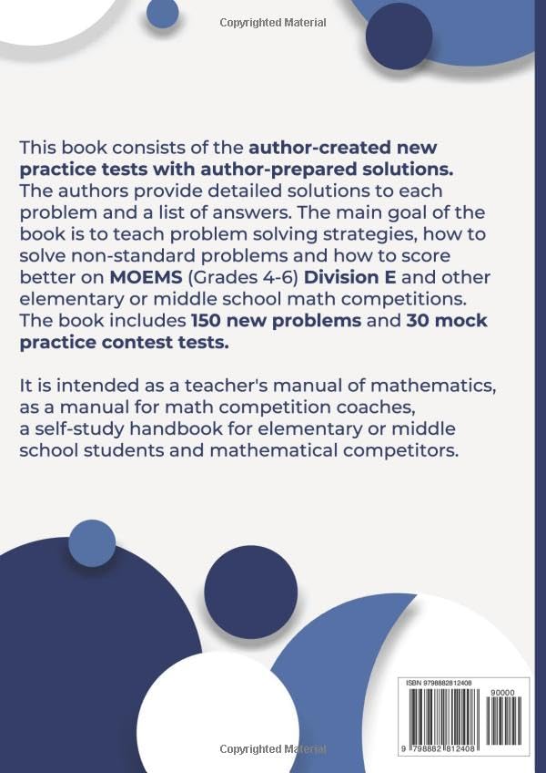 This book consists of the author-created new practice tests with author-prepared solutions. The authors provide detailed solutions to each problem and a list of answers. The main goal of the book is to teach problem solving strategies, how to solve non-standard problems and how to score better on MOEMS (Grades 4-6) Division E and other elementary or middle school math competitions. The book includes 150 problems and 30 mock practice contest tests. It is intended as a teacher’s manual of mathematics, as a manual for math competition coaches, a self-study handbook for elementary or middle school students and mathematical competitors. About the authors: Hayk Sedrakyan is an IMO medal winner, professional mathematical Olympiad coach in greater Boston area, Massachusetts, USA. He has been the dean (and one of the main developers) of one of the biggest math competition preparation programs in the USA. He has been a Professor of mathematics in Paris and has a PhD in mathematics (optimal control and game theory) from the Sorbonne University (UPMC), Paris, France. He is a Doctor of mathematical sciences in USA, France, Armenia and holds three master’s degrees in mathematics from institutions in Germany, Austria, Armenia and has spent a small part of his PhD studies in Italy. Hayk Sedrakyan has worked as a scientific researcher for the European Commission (sadco project), has been one of the Team Leaders at Harvard-MIT Mathematics Tournament (HMMT) and was an invited speaker at the Imperial College London. He took part in the International Mathematical Olympiads (IMO) in the United Kingdom, Japan and Greece. He has been elected as the President of the general assembly and a member of the management board of the Cite Internationale Universitaire de Paris (10,000 students, 162 different nationalities) and the same year they were nominated for the Nobel Prize. He is the son and was one of the students of Nairi Sedrakyan. Nairi Sedrakyan is the winner of one of the highest international awards in mathematics (Erdos Award 2022). For contributing to the development of mathematics worldwide. He is involved in national and international Mathematics Olympiads having been the President of Armenian Mathematics Olympiads and a member of the IMO problem selection committee. He is the author of one of the most difficult problems ever proposed in the International Mathematical Olympiad, the 5th problem of the 37th IMO. This problem is considered to be one the hardest problems in the IMO as none of the members of the strongest teams (national Olympic teams of China, USA, Russia) succeeded to solve it correctly, and because national Olympic team of China (the strongest team in the IMO) obtained a cumulative result of 0 points and was ranked 6th in the final ranking of the countries instead of the usual 1st or 2nd place. The British 2014 lm X+Y, released in the USA as A Brilliant Young Mind, inspired by the film Beautiful Young Minds (focuses on an English mathematical genius chosen to represent the United Kingdom at the IMO) also states that this problem is the hardest problem ever proposed in the history of the IMO (minutes 9:40-10:30). Nairi Sedrakyan’s students have received 20 medals in the International Mathematical Olympiad, including Gold and Silver medals. Nairi Sedrakyan received a Gold Medal for his contributions to World’s Mathematical Olympiads and Scientific Activities. MOEMS is Mathematical Olympiads for Elementary and Middle Schools, which is not affiliated with this book. All rights reserved. No part of this book may be used or reproduced in any manner without the written permission of the authors.