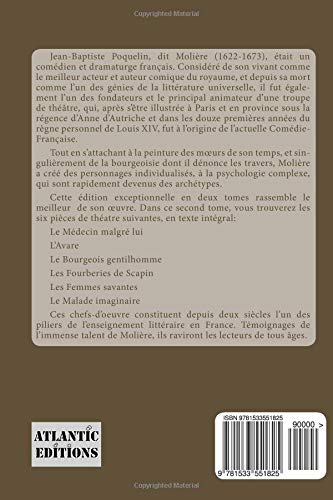 EDITION EXCEPTIONNELLE en format broche 6 pieces de theatre en TEXTE INTEGRAL, dans un ouvrage unique. Jean-Baptiste Poquelin, dit Moliere (1622-1673), etait un comedien et dramaturge francais. Considere de son vivant comme le meilleur acteur et auteur comique du royaume, et depuis sa mort comme l’un des genies de la litterature universelle, il fut egalement l’un des fondateurs et le principal animateur d’une troupe de theatre, qui, apres s’etre illustree a Paris et en province sous la regence d’Anne d’Autriche et dans les douze premieres annees du regne personnel de Louis XIV, fut a l’origine de l’actuelle Comedie-Francaise. Tout en s’attachant a la peinture des moeurs de son temps, et singulierement de la bourgeoisie dont il denonce les travers, Moliere a cree des personnages individualises, a la psychologie complexe, qui sont rapidement devenus des archetypes. Cette edition exceptionnelle en deux tomes rassemble le meilleur de son oeuvre. Dans ce second tome, vous trouverez les six pieces de theatre suivantes, en texte integral: Le Medecin malgre lui L’Avare Le Bourgeois gentilhomme Les Fourberies de Scapin Les Femmes savantes Le Malade imaginaire Ces chefs-d’oeuvre constituent depuis deux siecles l’un des piliers de l’enseignement litteraire en France. Temoignages de l’immense talent de Moliere, ils raviront les lecteurs de tous ages. Retrouvez le premier tome chez Atlantic Editions: Moliere: ses plus belles oeuvres, Tome 1 – ISBN 978-1533551764 (c) Atlantic Editions