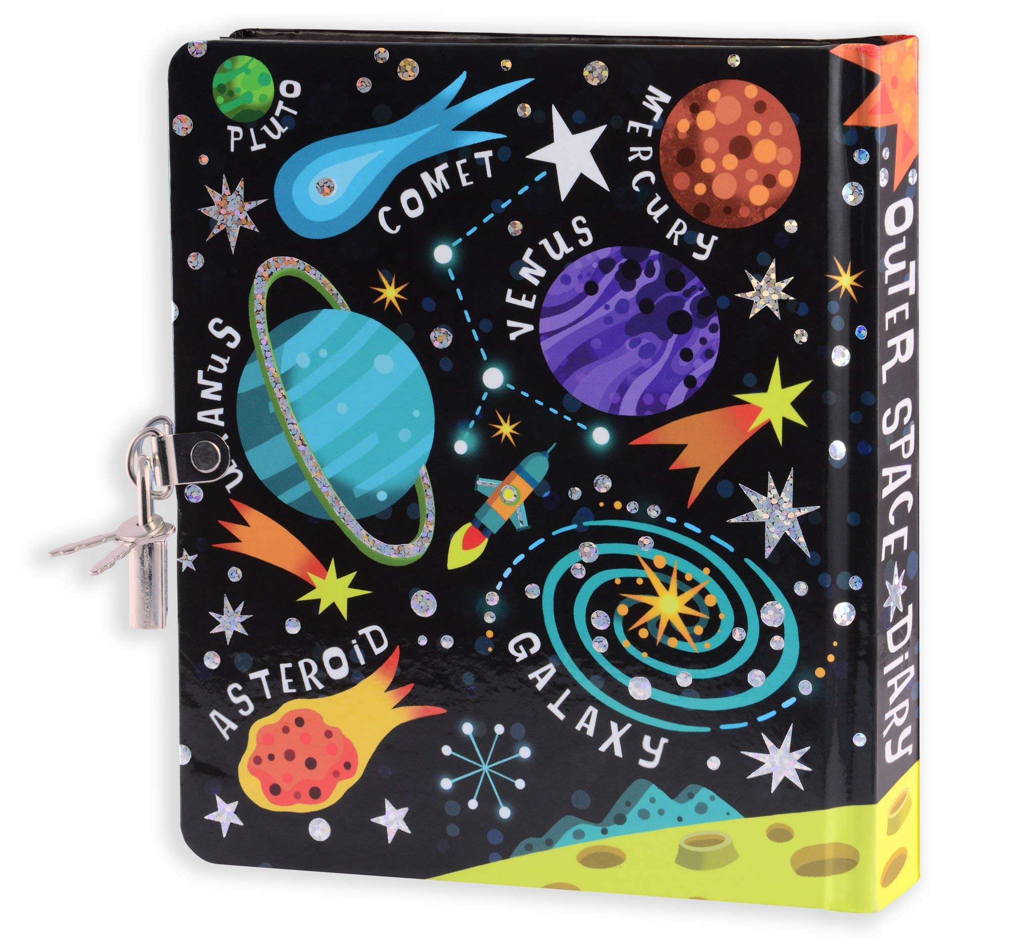 - Details: Blast off into another galaxy with this shiny foil diary that is out of this world! Measuring 5.5 inches wide by 6.25 inches high, this lock and key diary is the just the right size for budding writers.