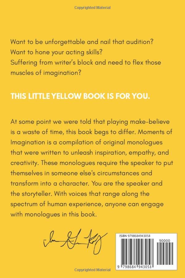 Want to be unforgettable and nail that audition? Want to hone your acting skills? Suffering from writer’s block and need to flex those muscles of imagination? Want to throw a party at which all attendees must perform a monologue? This little yellow book can help you. At some point we were told that playing make-believe is a waste of time, this book begs to differ. Moments of Imagination is a compilation of original monologues that were written to unleash inspiration, empathy, and creativity. These monologues require the speaker to put themselves in someone else’s circumstances and transform into a character. You are the speaker and the storyteller. With voices that range along the spectrum of human experience, anyone can engage with monologues in this book. Imani-Grace King is a screenwriter and actor, she has a passion for exploring various voices in her writing in order to connect with others and practice empathy.