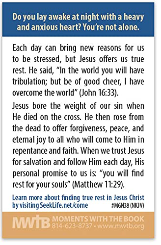 Do you lay awake at night with a heavy and anxious heart? You’re not alone. Each day can bring new reasons for us to be stressed, but Jesus offers us true rest. He said, “In the world ye shall have tribulation: but be of good cheer; I have overcome the world” (John 16:33). Jesus bore the weight of our sin when He died on the cross. He then rose from the dead to offer forgiveness, peace, and eternal joy to all who will come to Him in repentance and faith. When we trust Jesus for salvation and follow Him each day, His personal promise to us is: “ye shall find rest unto your souls” (Matthew 11:29).