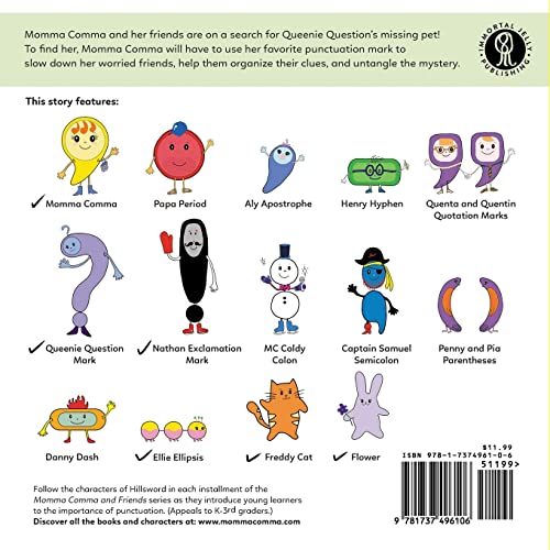 In Momma Comma and the Soup Drama, Momma Comma and her friends are on a search for Queenie Question’s missing pet! To find her, Momma Comma will have to use her favorite punctuation mark to slow down her worried friends, help them organize their clues, and untangle the mystery. Follow the whimsical characters of Hillsword in each installment of the Momma Comma and Friends series as they introduce young learners to the importance of punctuation. (Appeals to K – 3rd graders. Lexile 530) “It has been a couple of weeks since you visited our class. The students remember the characters and their names every time we write. They really enjoyed your story, and most importantly, they remember punctuation.” — Ms. Lupe Carbajal, first-grade teacher at Eagle Rock Elementary, LAUSD My class of 1st-3rd graders and I really enjoyed reading MOMMA COMMA AND THE SOUP DRAMA. The exciting plot and bright illustrations kept my students engaged throughout. I found it very natural to emphasize the punctuation rules along the way because the author does a great job of weaving them in with the plot. It was also nice for the range of ages I taught. Older students with more knowledge of punctuation had fun hunting for and noticing details that matched up with what they already knew. For my younger students, it was great exposure to content that they would be learning more about during the year. The kids especially enjoyed reading the character profile of each punctuation mark at the end of the book and wanted to read about the other punctuation characters in future books. A series like this would be such a great addition to any elementary classroom. — Eva Byram, teacher at Glendale Montessori, Glendale, CA