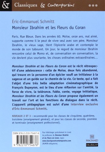 Paris, dans les annees 1960. Momo, garcon juif de 12 ans, mal aime, vit seul avec son pere. Ibrahim, le vieux sage, tient une epicerie arabe. Un jour, leurs regards se croisent… Ce texte, qui a fait l’objet d’une adaptation cinematographique magistrale de Francois Dupeyron, est le lieu d’une reflexion sur l’amitie, la force de vivre, la rencontre, les sources de tolerance. Fable, conte, voyage initiatique, Monsieur Ibrahim et les Fleurs du Coran propose aussi un travail sur l’art et les fonctions du dialogue dans le recit. L’appareil pedagogique est suivi d’une interview exclusive de l’auteur.