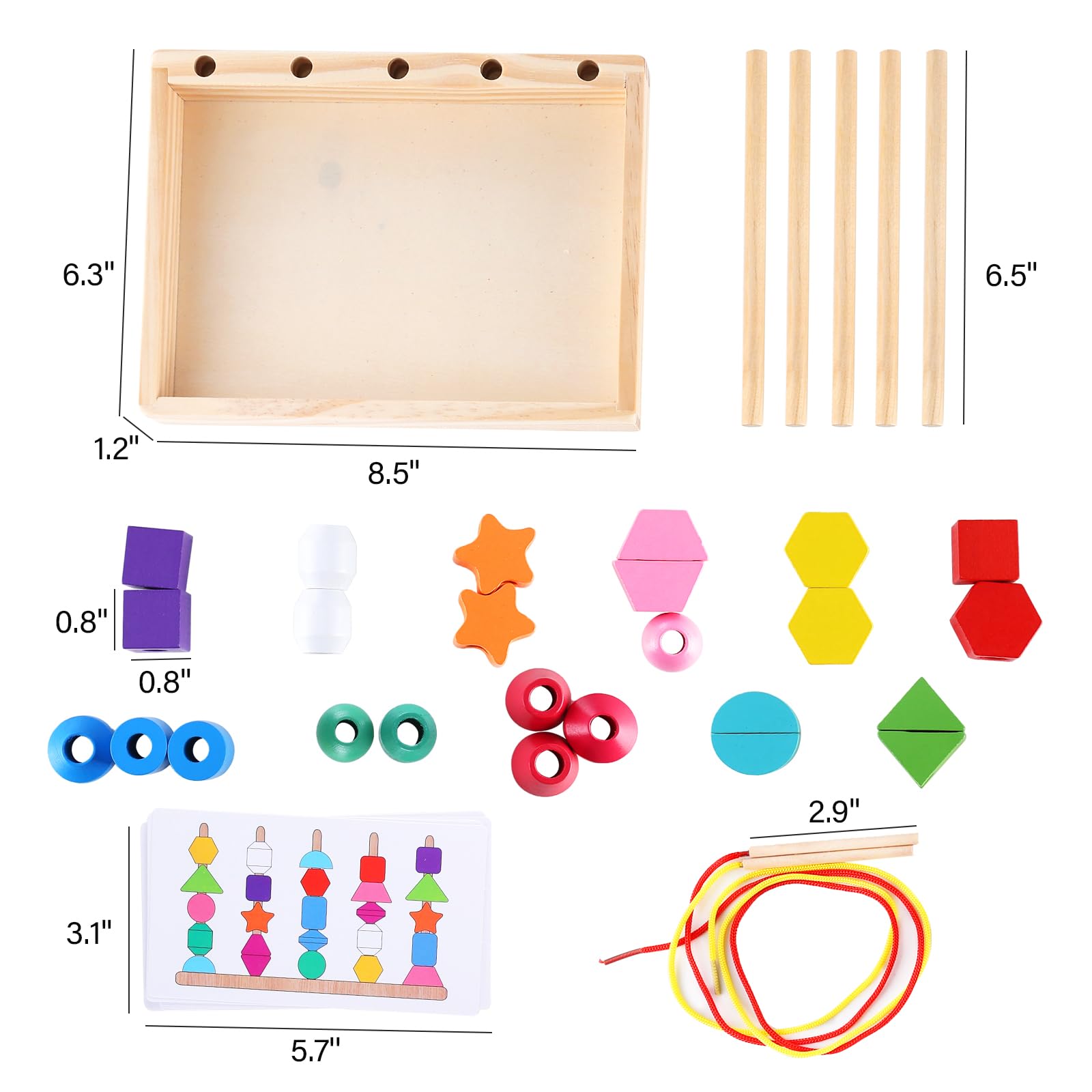 - Montessori Wooden Toy: This Bead sequencing set includes 1 wooden box, 5 pillars, 25 wooden beads of 11 colors, 2 laces with wooden sticks and 8 double-sided sequencing cards. There are multiple ways to play our Montessori toys: sequencing blocks, lacing beads, stacking, sorting, counting, color matching and shape recognizing