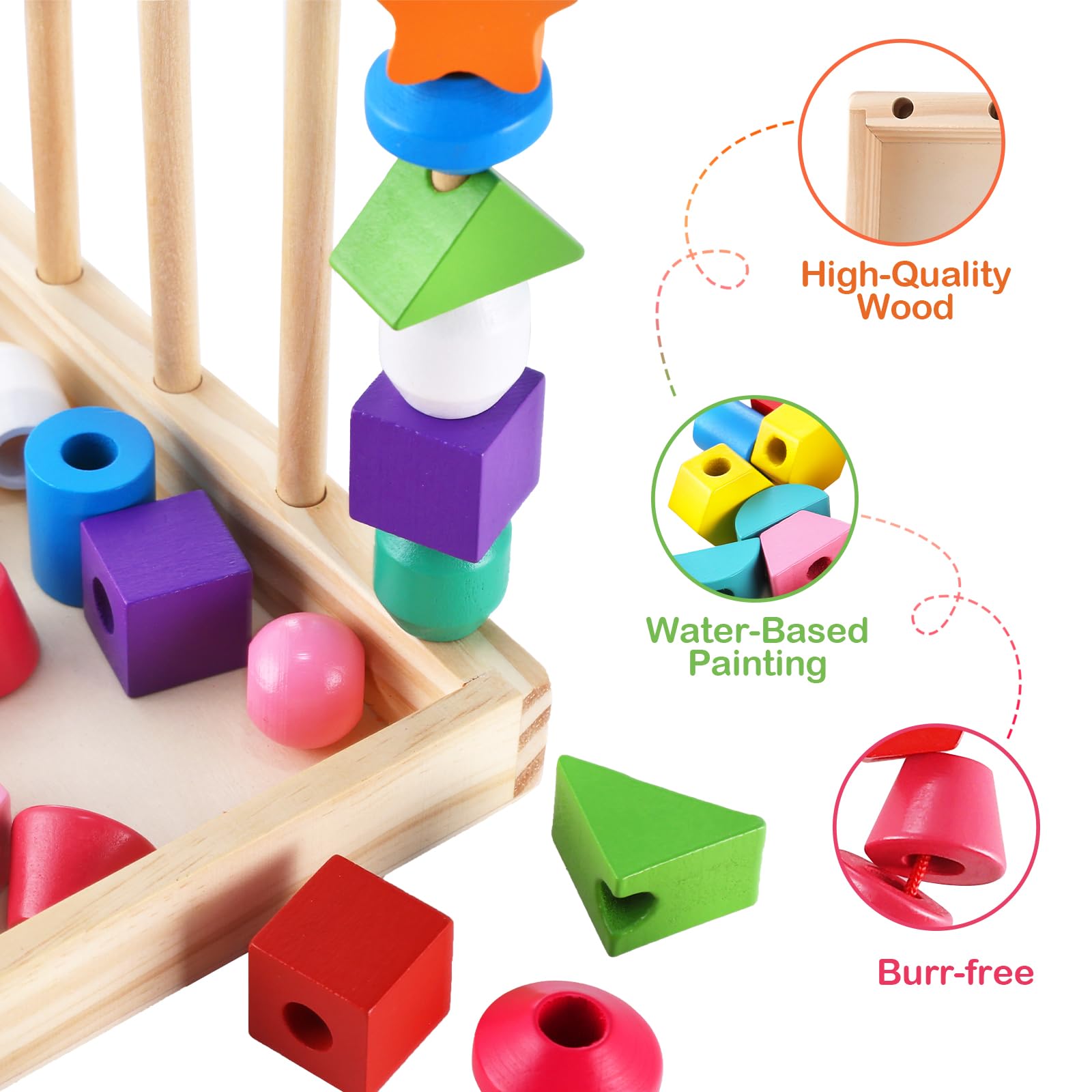 - Quality Wood Material: Bead sequencing toys are all made of quality solid wood with smooth edges that are sturdy and keep kids from being hurt. Water-based paint is used to cover the beads for kids to give a safe playing experience. All wooden blocks are lightweight, suitable size makes sure that toddlers can grasp it easily