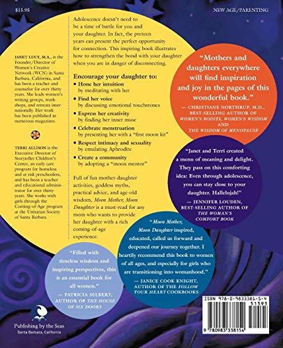 How would it be different if mothers looked forward to their daughters’ first steps into womanhood with the same anticipation and excitement as they had for her very first steps toward walking? What if there was a whole community of women waiting to receive her into womanhood? What if there was a way for mothers and daughters to walk together? With the moon as a guide and a symbol, Moon Mother, Moon Daughter introduces a whole new approach to the coming of age years, a time to strengthen the mother-daughter connection with the support of community, and celebrate female gifts and wisdom. Moon Mother, Moon Daughter is a practical and concrete guide rooted in ancient traditions and timeless wisdom. Each of the 12 chapters uses a goddess myth as its basis. The myth is followed by an exploration of the key coming of age concepts and divine feminine qualities (ie. intuition, creativity, dreaming) found within the myth, activities and suggestions for mothers and daughters, and a list of further reading and resources. Moon Mother, Moon Daughter also offers an ideal format for women’s groups and classes of all ages. It’s never too late to come of age. “Mothers and daughters everywhere will find inspiration and joy in the pages of this wonderful book.” ~ Christiane Northrup, M.D., Best-selling author of Women’s Bodies, Women’s Wisdom and The Wisdom of Menopause “Janet and Terri created a menu of meaning and delight. They pass on this comforting idea: Even through adolescence, you can stay close to your daughter. Hallelujah!” ~ Jennifer Louden, best-selling author of The Woman’s Comfort Book “Filled with old-world wisdom and practical advice, this is an invaluable, inspiring and essential book for all mothers, and daughters.” ~ Patricia Selbert, author of The House of Six Doors “Moon Mother, Moon Daughter inspired, educated, called us forward and deepened our journey together. I heartily recommend this book to women of all ages, and especially for girls who are transitioning into womanhood.” ~ Janice Cook Knight, author of the Follow Your Heart Cookbooks