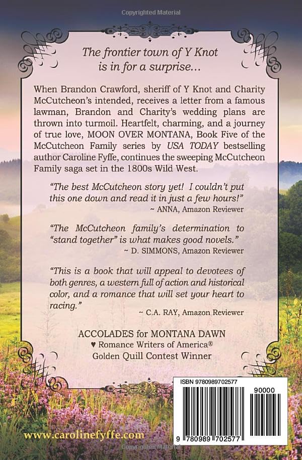 MOON OVER MONTANA, The McCutcheon Family Series, Book 5 Y Knot, Montana Territory, 1886 The long-awaited wedding date has finally been set, but when a young Cheyenne woman shows up in the loft of her family’s barn, life as Charity McCutcheon knew it is thrust into chaos. Secrets her parents and brother Luke have held now explode with the power to shake her foundations. When Brandon Crawford, Charity’s intended and sheriff of Y Knot, is drawn away by the haunting memory from a tragic event that happened over fifteen years ago, the couple faces the first test of their love. Will fate rip them apart? Can Charity and Brandon set their conflicts aside and build a marriage worth waiting for? Heart-felt, charming, and a journey of true love, Moon Over Montana, Book 5 of the McCutcheon Family Series continues the sweeping McCutcheon Family saga set in the 1800’s Wild West. Books of the Western Historical Romance McCutcheon Family Series Montana Dawn Texas Twilight Mail-Order Brides of the West: Evie Mail-Order Brides of the West: Heather Moon Over Montana Mail-Order Brides of the West: Kathryn Montana Snowfall Texas Lonesome Montana Courage Montana Promise Montana Reunion Montana Surprise Watch for more uplifting McCutcheon Family novels to come…