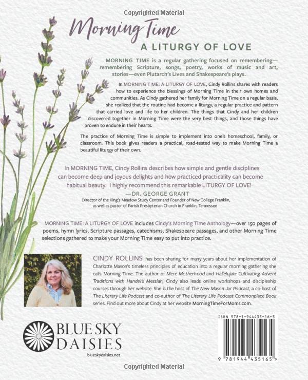 MORNING TIME: A LITURGY OF LOVE MORNING TIME is a regular gathering focused on remembering–remembering Scripture, songs, poetry, works of music and art, stories–even Plutarch’s Lives and Shakespeare’s plays. Cindy Rollins shares with readers how to experience the blessings of Morning Time in their own homes and communities. As Cindy gathered her family for Morning Time on a regular basis, she realized that the routine had become a liturgy, a regular practice and pattern that carried love and life to her children. The things that Cindy and her children discovered together in Morning Time were the very best things, and those things have proven to endure in their hearts. The practice of Morning Time is simple to implement into one’s homeschool, family, or classroom. This book gives readers a practical, road-tested way to make Morning Time a beautiful liturgy of their own. It includes Cindy’s Morning Time Anthology–over 150 pages of poems, hymn lyrics, Scripture passages, catechisms, Shakespeare passages, and other Morning Time selections gathered to make your Morning Time easy to put into practice. CINDY ROLLINS has been sharing for many years about her implementation of Charlotte Mason’s timeless principles of education into a regular morning gathering she calls Morning Time. The author of Mere Motherhood and Hallelujah: Cultivating Advent Traditions with Handel’s Messiah, Cindy also leads online workshops and discipleship courses through her website. She is the host of The New Mason Jar Podcast, a co-host of The Literary Life Podcast and co-author of The Literary Life Podcast Commonplace Book series. Find out more about Cindy at her website MorningTimeForMoms.com