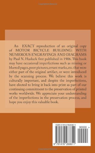 AN EXACT reproduction from an original copy of this very hard book to find: MOTOR BICYCLE BUILDING: WITH NUMEROUS ENGRAVINGS AND DIAGRAMS by Paul N. Hasluck first published in 1906. THIS IS A SCANNED REPRODUCTION OF THE ORIGINAL BOOK – IT IS NOT AN OCR SCAN TO TEXT. This book may have occasional imperfections such as missing or blurred pages, poor pictures, errant marks, etc. that were either part of the original artifact, or were introduced by the scanning process. We believe this work is culturally important, and despite the imperfections, have elected to bring it back into print as part of our continuing commitment to the preservation of printed works worldwide. We appreciate your understanding of the imperfections in the preservation process, and hope you enjoy this valuable book