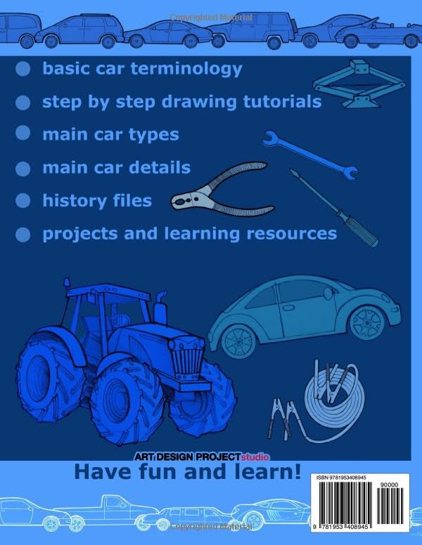 Learn the basic information about motorcycles, cars, and tractors with visual dictionary type illustrations. basic car terminology with corresponding illustrations for visual learning step by step drawing guides: easy to follow tutorials for drawing a motorcycle, a car, a tractor, and a vintage military vehicle main car types illustrated in the form of a basic pictorial dictionary main car details: illustrated and named history files (classic patent art as an inspirational historic visual information) projects and learning resources: outlining, drawing, and coloring resources as well as visual quizzes and learning tests for fun and education Perfect for kids who love cars, enjoy drawing and want to be knowledgeable about the automotive world and auto mechanics.
