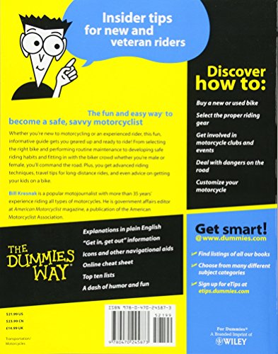 A practical guide that gets you geared up with proper riding techniques, safety gear, indispensable items for long trips, and handling characteristics of various motorcycle types Few activities offer more fun and excitement than motorcycling, but to get the most out of it, there’s a lot you need to know, and that’s where this informative motorcycle guide written in plain English comes in. From buying and maintaining a bike, to riding safely, to finding great places to ride, Motorcycling For Dummies puts you on the road with savvy and style, whether you’re new to riding or an experienced motorcyclist. You’ll get plenty of help in selecting the right bike and step-by-step instructions on performing routine maintenance tasks. You’ll also find out how to develop safe riding habits and, maybe most important of all, you’ll learn more about motorcycling organizations and how to fit in with the biker crowd. Plus, this hands-on resource shows you advanced riding techniques, offers travel tips for long-distance rides, and even helps you get your kids started in motorcycling. Discover how to: Buy a new or used bike Select safe, tough riding gear, from helmet and jacket to boots and pants Get proper training and learn essential riding skills Insure your bike Pass even the toughest licensing test Try your hand at cruising, touring, sports biking, and more Get involved in motorcycle clubs and events Deal with dangers on the road Customize your bike to improve both style and performance This comprehensive guide concludes with a motorcycling glossary, a guide to motorcycling laws by state, and an appendix with plenty of online resources. Complete with lists of can’t-miss biking events, legendary motorcyclists, and must-see motorcycling movies, Motorcycling For Dummies gives a whole new meaning to the term “easy rider”.