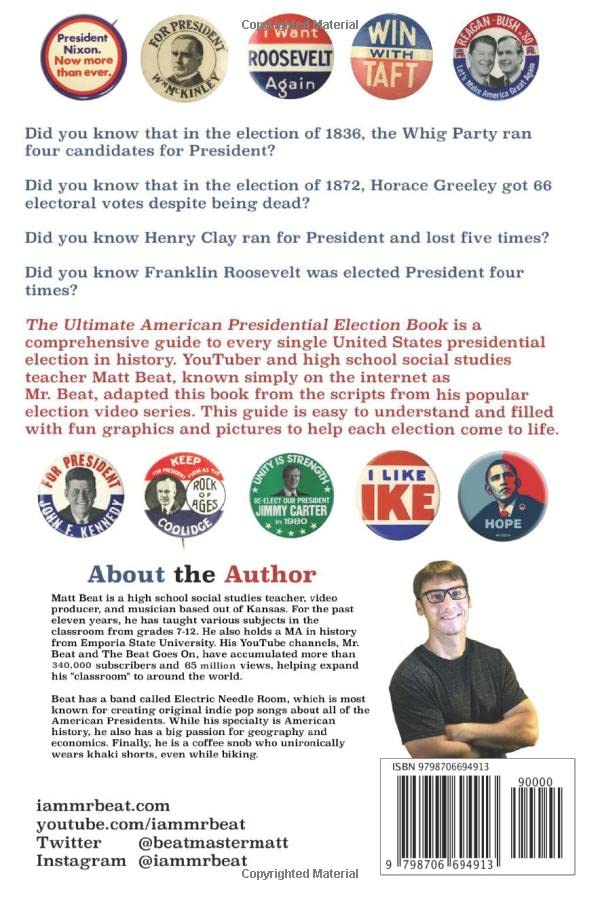 NOW UPDATED TO INCLUDE THE 2020 ELECTION. Did you know that in the election of 1836, the Whig Party ran four candidates for President? Did you know that in the election of 1872, Horace Greeley got 66 electoral votes despite being dead? Did you know Henry Clay ran for President and lost five times? Did you know Franklin Roosevelt was elected President four times? The Ultimate American Presidential Election Book is a comprehensive guide to every single United States presidential election in history. YouTuber and high school social studies teacher Matt Beat, known simply on the internet as Mr. Beat, adapted this book from the scripts from his popular election video series. This guide is easy to understand and filled with fun graphics and pictures to help each election come to life.