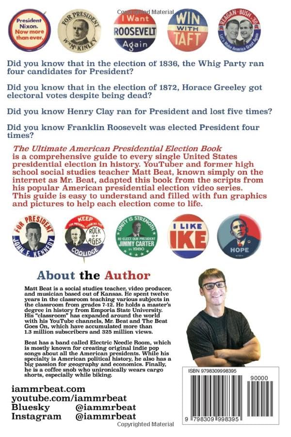 NOW UPDATED TO INCLUDE THE 2024 ELECTION. Did you know that in the election of 1836, the Whig Party ran four candidates for President? Did you know that in the election of 1872, Horace Greeley got 66 electoral votes despite being dead? Did you know Henry Clay ran for President and lost five times? Did you know Franklin Roosevelt was elected President four times? The Ultimate American Presidential Election Book is a comprehensive guide to every single United States presidential election in history. YouTuber and former high school social studies teacher Matt Beat, known simply on the internet as Mr. Beat, adapted this book from the scripts from his popular American presidential election video series. This guide is easy to understand and filled with fun graphics and pictures to help each election come to life.