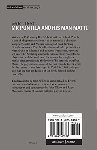 Written in 1940 during Brecht’s exile in Finland, Puntila is one of his greatest creations – to be ranked alongside Galileo and Mother Courage. A hard-drinking Finnish landowner, Puntila suffers from a divided personality: when drunk he is human and humane; when sober, surly and self-centred. The play contains some of the best comedy Brecht wrote for the theatre. This translation by John Willett is accompanied by Brecht’s own notes and relevant texts, as well as an extensive introduction and commentary by John Willett and Ralph Manheim, editor’s of Brecht’s collected plays in English.