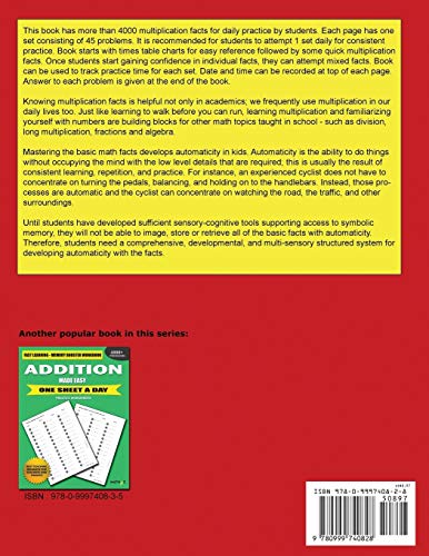 This book has more than 4000 multiplication facts for daily practice by students. Each page has one set consisting of 45 problems. It is recommended for students to attempt 1 set daily for consistent practice. Book starts with times table charts for easy reference followed by some quick multiplication facts. Once students start gaining confidence in individual facts, they can attempt mixed facts. Book can be used to track practice time for each set. Date and time can be recorded at top of each page. Answer to each problem is given at the end of the book.Knowing multiplication facts is helpful not only in academics; we frequently use multiplication in our daily lives too. Just like learning to walk before you can run, learning multiplication and familiarizing yourself with numbers are building blocks for other math topics taught in school – such as division, long multiplication, fractions and algebra.Mastering the basic math facts develops automaticity in kids. Automaticity is the ability to do things without occupying the mind with the low level details that are required; this is usually the result of consistent learning, repetition, and practice. For instance, an experienced cyclist does not have to concentrate on turning the pedals, balancing, and holding on to the handlebars. Instead, those processes are automatic and the cyclist can concentrate on watching the road, the traffic, and other surroundings.Until students have developed sufficient sensory-cognitive tools supporting access to symbolic memory, they will not be able to image, store or retrieve all of the basic facts with automaticity. Therefore, students need a comprehensive, developmental, and multi-sensory structured system for developing automaticity with the facts.