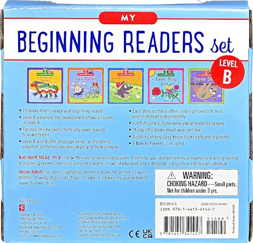 Boost your child’s reading accomplishments with this set of 25 fun, full-color Level B early reader books! Level B books focus on long vowel sounds and simple compound words. Young readers will also continue learning essential sight words and building reading skills they started in Level A. Each book lists the sight words and skills found inside. Self-contained books have just one or two lines of text per page to help children decode words on their own and learn to read with confidence. Full-color illustrations and fun stories involving animals and children will keep young readers entertained and engaged. Boxed set of 25 softcover books. Each book has 8 pages. Sturdy little books resist wear and tear. Books measures 6” square. Colorful storage case keeps books safe and organized. Storage cases measure 6.25” wide x 6.25” high x 1.4” deep.