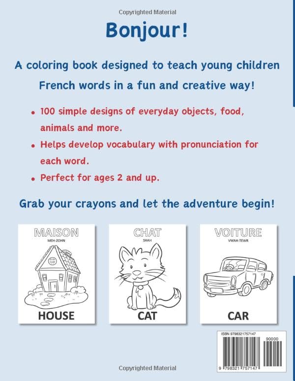 Bonjour! Embark on an exciting linguistic adventure with My First 100 French Words Coloring Book. This coloring book introduces children to 100 French words, each accompanied by simple illustrations and pronunciation. 100 illustrations of familiar everyday objects such as animals, food, weather, seasons, and more, to build vocabulary. All pictures are labeled with the English word and the French equivalent with phonetic spellings for proper pronunciation. Ages 2 and up! This coloring book is a fun way for young English-speaking children to build a basic vocabulary in French. Grab a copy of My First 100 French Words Coloring Book today!