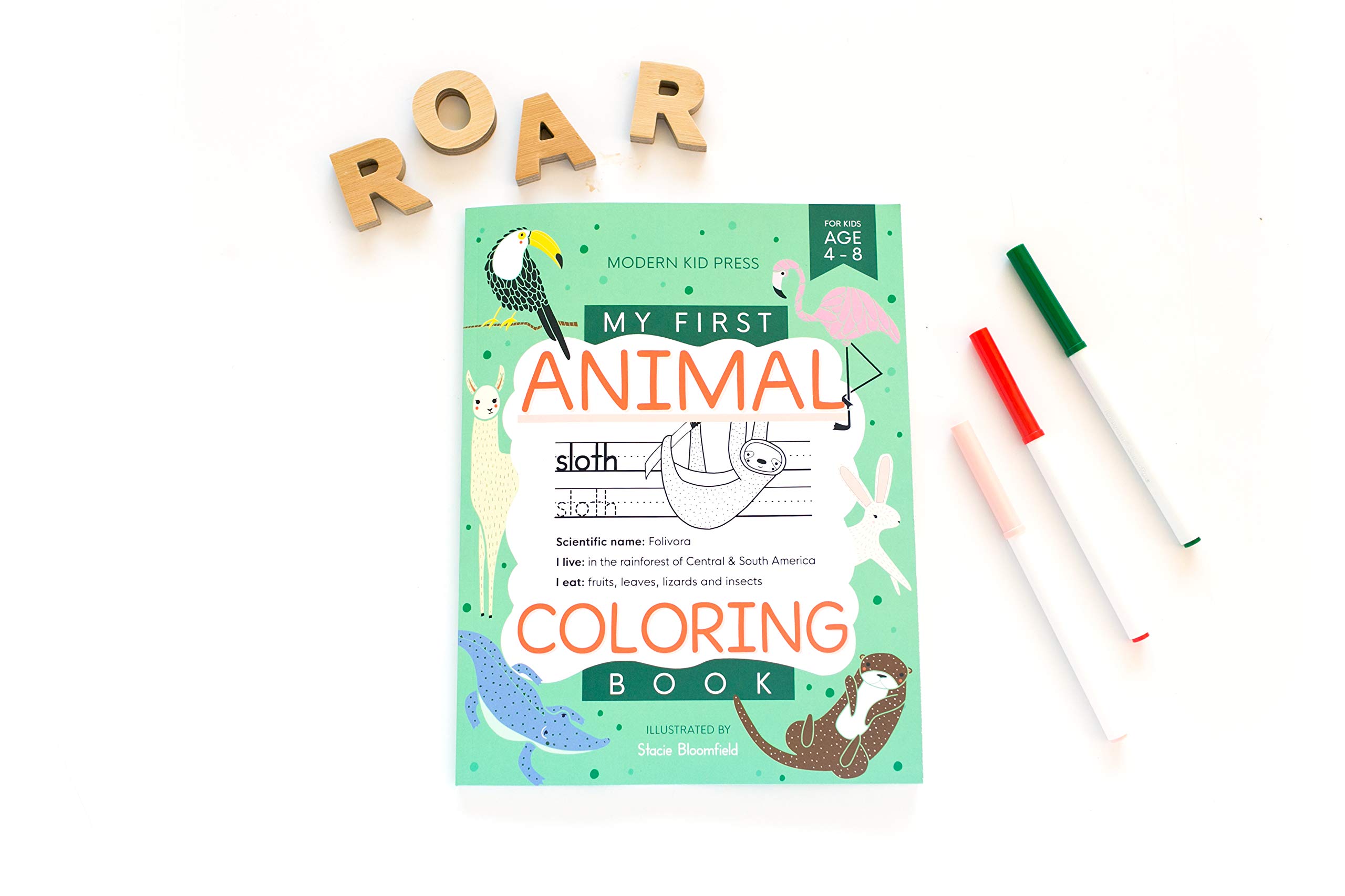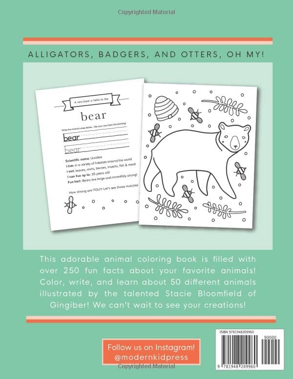 Learn over 250 fun facts and color your favorite animals with this adorable animal coloring book! Alligators, badgers, and otters, oh my! Modern Kid Press has teamed up with Stacie Bloomfield of Gingiber to create a book about animals that your child will love! My First Animal Coloring Book for Ages 4-8 is a great way for your little one to have fun learning about a wide variety of animals on land, in the sea, and in the sky! Learn over 250 facts about 50 different animals! Your little one will practice handwriting by writing each animal name as well as work on fine motor skills while coloring in the adorable illustrations by Stacie Bloomfield of Gingiber! Why You’ll Love this Book Fun and fundamental activities. Practice fine motor skills and handwriting while learning about some of the coolest animals on the planet. Adorable Animals. The fun animal coloring pages will keep your little ones engaged and help them develop important skills such as holding the pencil correctly, controlling the marker as they color in the lines, and building hand muscles that will also aid with writing. Practically sized and high quality paper. The book is sized at 8.5 x 11 which gives even the smallest hands plenty of space to complete the exercises. About Modern Kid Press Modern Kid Press is a husband + wife run publishing company! We are passionate about creating cute and practical books for kids! The Book Contains: Premium matte cover design Printed on high quality 60lb interior stock Perfectly sized at 8.5″ x 11″