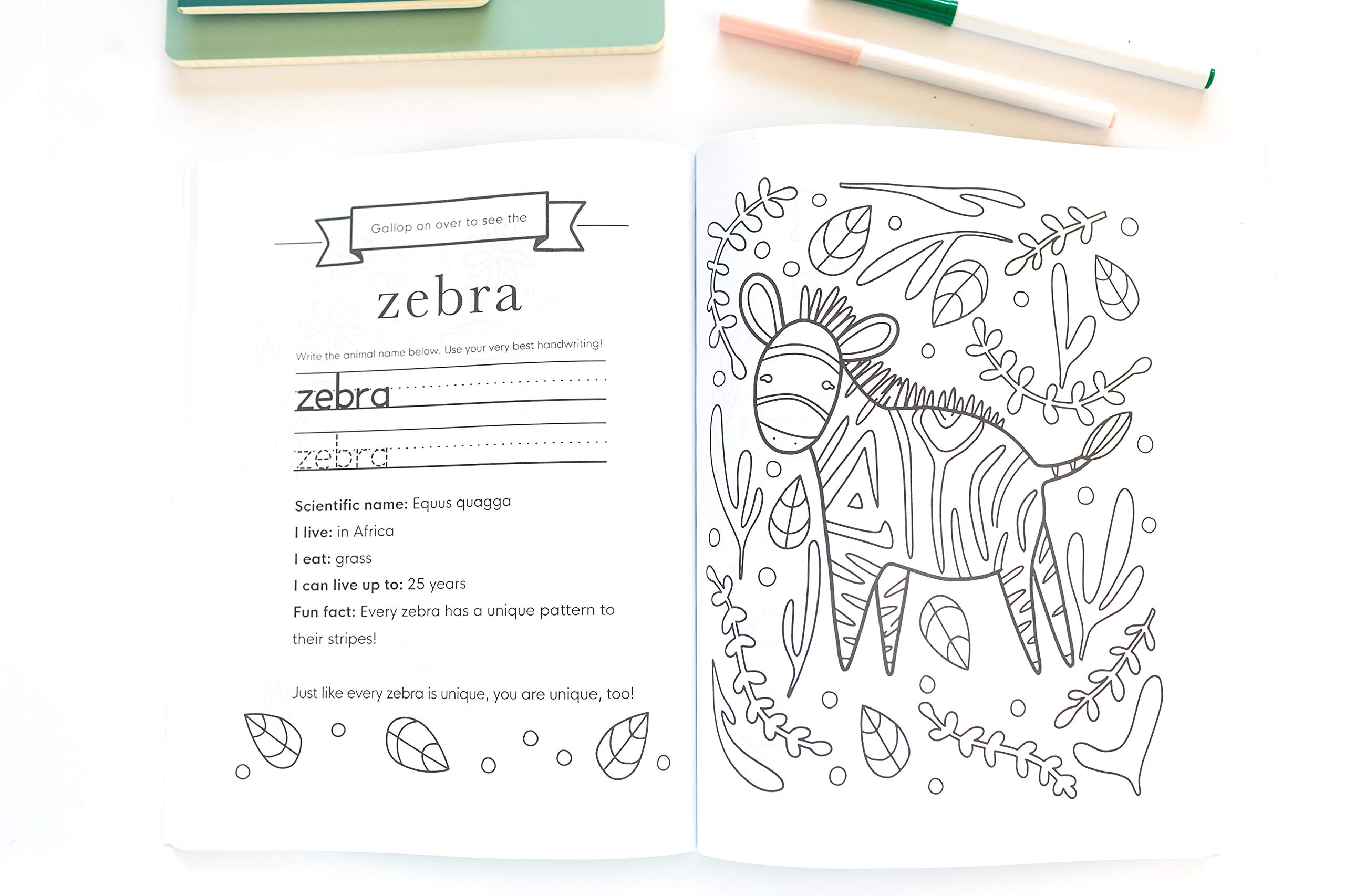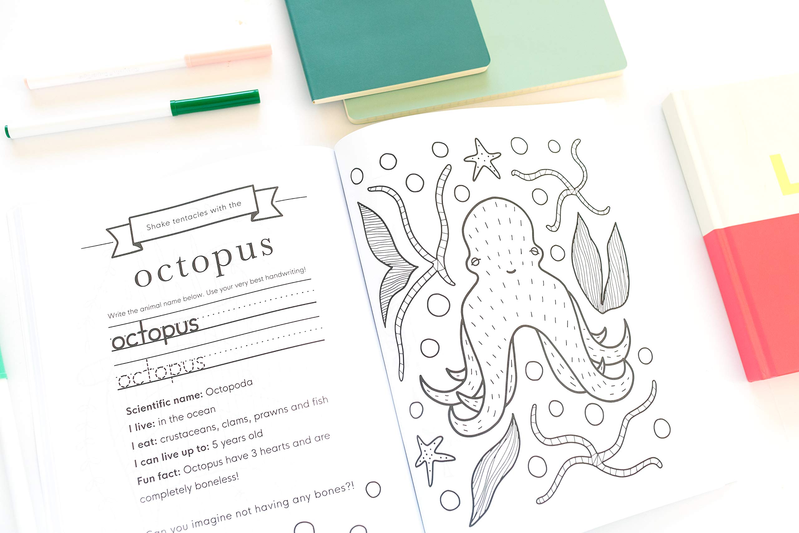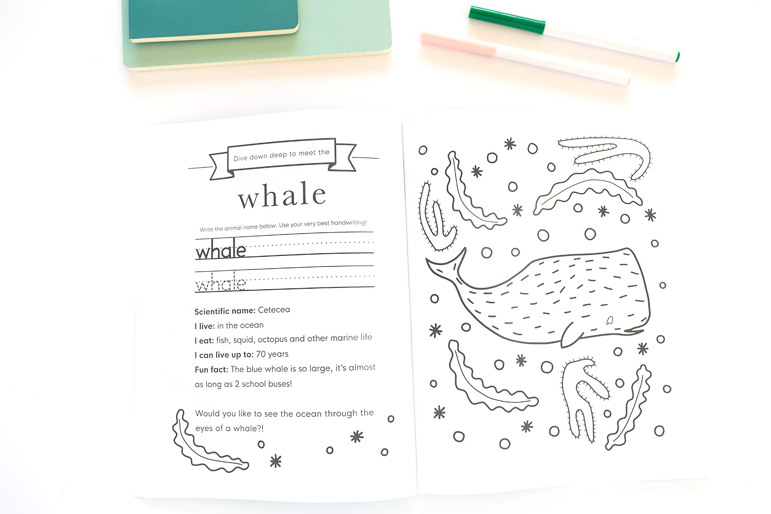 This educational coloring book helps children learn facts about animals, practice handwriting, and develop fine motor skills.