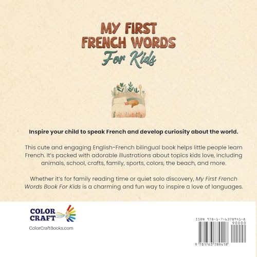 Inspire your child to speak French young – and develop curiosity about the world. This exciting, cute and engaging English-French bilingual book helps little people learn French. Perfect for parents, grandparents, teachers, uncles, aunts and friends who want to help children learn SFrench early… the fun way. Packed with cute illustrations for over 250 French words, this book fosters a love for languages as young as 2 years old. Featuring 25 exciting topics, including: Wild animals, pets, farm animals, school, family and more. Whether for family reading time, pre-bedtime relaxation or quiet solo reading, My First French Words Book For Kids is a charming and educational way to inspire a love of languages. What makes this book special? See your child’s face light up with adorable illustrations: Every word is paired with a cute illustration that kids love, keeping them excited to turn each page. Real-world vocab they’ll actually use: With a wide variety of everyday topics, this book covers 250+ essential French words relevant to what kids do every day. Family-focused learning: Designed for shared reading, parents and children will love exploring new words together. A must-have for parents wanting to introduce bilingual learning early. Imagine your child speaking French from the beginning of their life… with a love of foreign languages and curiosity about the world.. right from the start. This book could be the beginning of a lifelong adventure. French is a useful and beautiful language, spoken by over 500 million people worldwide. Early exposure makes a big difference. Order your copy today and start your child’s journey into French language and culture – with fun, excitement, and cuteness on every page.