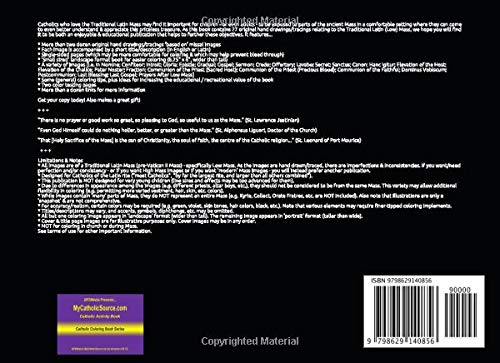 My Little Latin Mass Coloring Book: 25+ Traditional Latin Mass Coloring Images For Children Or Adults [Low Mass] + + + “Enjoyable & Educational!” + + + Catholics who love the Traditional Latin Mass may find it important for children – or even adults – to be exposed to parts of the ancient Mass in a comfortable setting where they can come to even better understand & appreciate this priceless treasure. As this book contains 27 original hand drawings/tracings relating to the Traditional Latin (Low) Mass, we hope you will find it to be both an enjoyable & educational publication that helps to further these objectives. It features… * More than two dozen original hand drawings/tracings ‘based on’ missal images * Each image is accompanied by a short title/description (in English or Latin) * Single-sided pages (which may be more comfortable for coloring & which may help prevent bleed through) * ‘Small sized’ landscape format book for easier coloring (8.25″ x 6″, wider than tall) * A variety of images [i.e. In Nomine; Confiteor; Introit; Gloria; Epistle; Gradual; Gospel; Sermon; Credo; Offertory; Lavabo; Secret; Sanctus; Canon; Hanc Igitur; Elevation of the Host; Elevation of the Chalice; Pater Noster; Fraction; Communion of the Priest (Sacred Host); Communion of the Priest (Precious Blood); Communion of the Faithful; Dominus Vobiscum; Postcommunion; Last Blessing; Last Gospel; Prayers After Low Mass] * Some (general) coloring tips, plus ideas for increasing the educational / recreational value of the book * Two color testing pages * More than a dozen links for more information Get your copy today! Also makes a great gift! + + + “There is no prayer or good work so great, so pleasing to God, so useful to us as the Mass.” (St. Lawrence Justinian) “Even God Himself could do nothing holier, better, or greater than the Mass.” (St. Alphonsus Liguori, Doctor of the Church) “That [Holy Sacrifice of the Mass] is the sun of Christianity, the soul of faith, the centre of the Catholic religion…” (St. Leonard of Port Maurice) + + + Limitations & Notes * All images are of a Traditional Latin Mass (pre-Vatican II Mass) – specifically Low Mass. As the images are hand drawn/traced, there are imperfections & inconsistencies. If you want/need perfection and/or consistency – or if you want High Mass images or if you want ‘modern’ Mass images – you will instead prefer another publication. * Designed for Catholics of the Latin rite (“most Catholics”). * This publication is NOT designed for very young children (line sizes and effects may be too advanced for them). * Due to differences in appearance among the images (e.g. different priests, altar boys, etc.), they should not be considered to be from the same Mass. This variety may allow additional flexibility in coloring (e.g. permitting more varied vestment, hair, skin, etc. colors). * While images contain ‘many’ parts of Mass, they do NOT represent an entire Mass. For example, the following are NOT included: Kyrie, Collect, Orate Fratres, etc. Also note that illustrations are only a ‘snapshot’ and are not comprehensive. * For accuracy/realism, certain colors may be required (e.g. green, violet, skin tones, hair colors, black, etc.). Note that various elements may require finer-tipped coloring implements. * Titles/descriptions may vary, and accents, symbols, diphthongs, etc. may be omitted. * All but one coloring image appears in ‘landscape’ format (wider than tall). The remaining image is in ‘portrait’ format (taller than wide). * Cover images are for illustrative purposes only and may be in any order. * NOT for coloring in church. * No copying or any other duplication allowed (sorry, no digital or pdf copy is available). See terms of use for other important information.