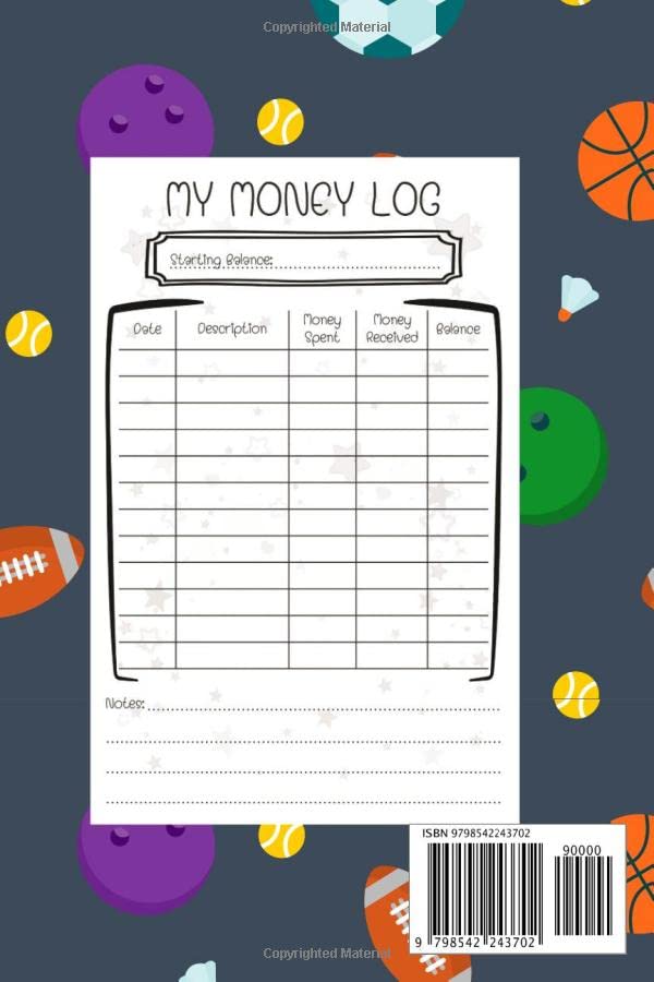 My Money Log Book For Sports Lover – Kids Friendly Consists Of: – Starting Balance – Five columns: date, description, money spent, money received, and balance Best for kids to start learning saving and financial education.