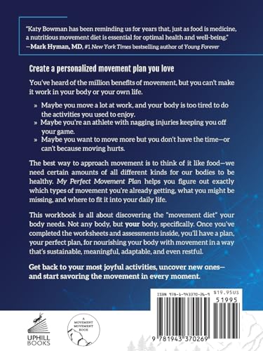 2024 Foreword Indie Award Finalist Create a personalized movement plan you love. You’ve heard of the million benefits of movement, but you can’t make it work in your body or your own life. Maybe you move a lot at work, and your body is too tired to do the activities you used to enjoy. Maybe you’re an athlete with nagging injuries keeping you off your game. Maybe you want to move more but you don’t have the time–or can’t because moving hurts. The best way to approach movement is to think of it like food–we need certain amounts of all different kinds for our bodies to be healthy. My Perfect Movement Plan helps you figure out exactly which types of movement you’re already getting, what you might be missing, and where to fit it into your daily life. This workbook is all about discovering the “movement diet” your body needs. Not any body, but your body, specifically. Complete dozens of self-assessment questions and worksheets to develop a plan–your perfect plan–for nourishing your body with movement in a way that’s sustainable, meaningful, adaptable, and even restful. Get back to your most joyful activities, uncover new ones–and start savoring the movement in every moment.