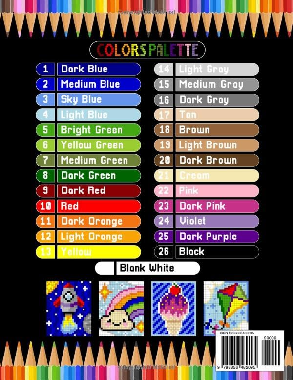 COLORFUL MOSAIC! COLOR BY NUMBER BOOK FOR KIDS. Mosaic Art – Color By Number features over 26 illustrations of Cute Animals, Landscape, Flowers and lots more. These are designed in a mosaic pattern where final image is a surprise until it’s completed! This book is real fun for kids who can color with precision. The illustrations are sure to challenge you and keep you engaged for long hours. You can try cross stitch method by putting a cross (x) to the corresponding colors/numbers which will give you amazing results. The pages are in portrait. The book has new 26 colors of palette which is located at the back side of cover. You can try your own palette on the pages places in the end of the book Makes a wonderful and unique gift! Get Your Copy Today!