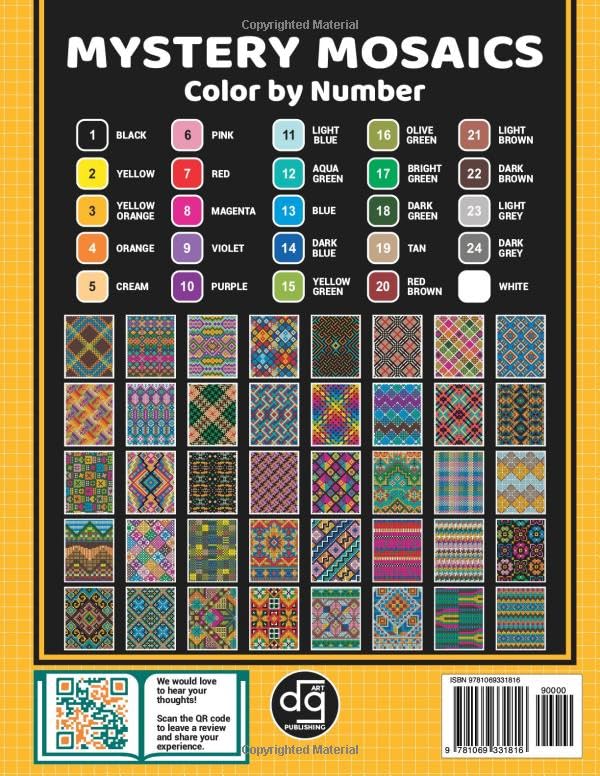 Enjoy hours of therapeutic coloring with 40 unique Geometric Patterns designs. This Mystery Mosaics Coloring book includes diamonds and squares designs (4,6 mm or 3/16 inch). Each page is a mystery waiting for you to reveal the picture hidden by the numbers. Your mind will be immersed in the excitement of the game of finding numbers and colors. The color patches are gradually revealed, connecting with each other to create a surprise about the overall image after you finish. Book Specifications 40 unique geometric designs with diamonds and squares Color Number Swatches are on the bottom part of each mosaic page, making it easier for you to have everything on the same page in case you wish to detach the page and color separately 25 Color Palette Sample printed on the back cover (you can get creative with your colors) NOTE: Like many other coloring books, the paper is thin, therefore if you are using markers, gel pens, or other wet coloring mediums, please always place a cardstock or several pages under the page you are coloring to prevent bleed-through and protect the next page. This is also a best practice even if you are using colored pencils. Before starting coloring, you can make a color bleeding test on the blank pages at the end of this book. A large variety and difficulty levels of designs for both beginners and experienced colorists Single-sided pages with white background color Happy Coloring!