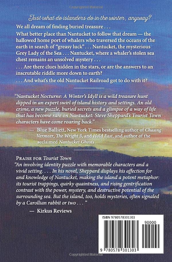 In this sequel to the award-winning Tourist Town, echoes of Nantucket’s whaling past resound through the island’s cobblestone streets as winter settles in. Not only are whales once again spotted in surrounding waters, the decades-old robbery of a whaling-era sea chest sends several winter denizens searching for clues in hopes of solving the mystery. In Nantucket Nocturne: A Winter’s Idyll the answer to the eternal question, “Just what do islanders do in the winter?”, becomes obvious — plenty! As New York Times bestselling author Blue Balliett exclaims: “Steve Sheppard’s Tourist Town characters have come roaring back.”
