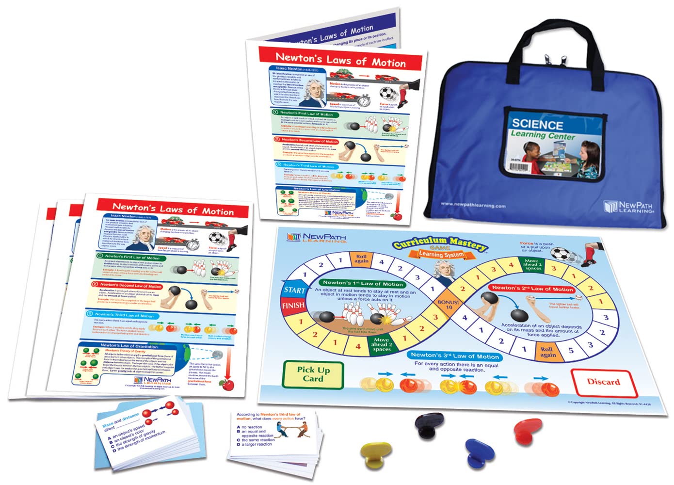 Designed for either teacher-directed instruction or independent use by groups of up to 4 students, the Learning Center covers Newton’s Laws of Motion. Includes four Visual Learning Guides – all focused on this key topic – for direct instruction through an easy-to-follow topic overview; “write-on/wipe-off” activities; and guiding, assessment review questions. Also provides a Curriculum Mastery Game for small group review, featuring one set of 30 illustrated, self-checking question cards; a laminated game-board; materials for four players; and student instructions. Perfect for use in the classroom, after-school programs, or even at home! Provides materials for up to 4 students, takes only minutes to set up and stores in the zippered pouch provided for years of use!