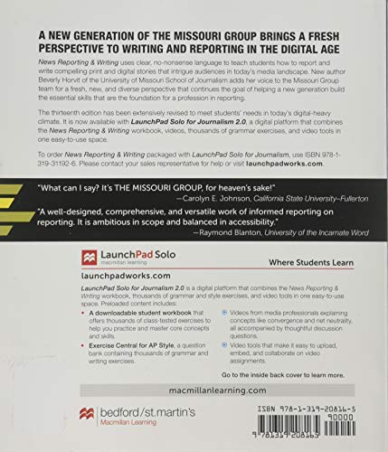 News Reporting & Writing teaches the essential reporting and writing skills within the context of today’s digital media landscape. The Missouri Group, including new author, Beverly Horvit, have extensively revised this edition with diverse examples and a focus on the role of technology to give students a strong foundation in the craft and raise awareness of current issues like fake news and censorship. The team focuses on developing the skills journalists actually use and the many careers in which they, and students, could use them–from working in news, to advertising, to public relations. Much of the text has been rewritten and reorganized to introduce a stronger flow of content paired with the most current coverage of today’s news industry. And now, Achieve for News Reporting and Writing sets the standard for developing student media writing skills through an all-in-one learning platform that combines the e-book, diagnostics, and powerful media writing tools. A diagnostic grammar and AP style quizzing tool and individualized study plans address the basics, while Achieve Writing Tools guides students through drafting their stories, rubric assessment, peer review, reflection, and revision. Fully editable pre-built writing assignments with rubrics keep students’ media writing skills sharp, allowing space for drafting, peer review, reflection and revision: all in one easy-to-use platform.