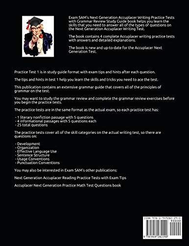 Exam SAM’s Next Generation Accuplacer Writing Practice Tests book helps you learn the skills that you need to answer all of the types of questions on the Next Generation Accuplacer Writing Test. The book contains 4 complete Accuplacer writing practice tests with answers and detailed explanations. The book is specially designed and focused for the Accuplacer Next Generation Test. Practice Test 1 is in study guide format with exam tips and hints after each question. The tips and hints in test 1 help you learn the skills and tricks you need to ace the test. This publication contains an extensive grammar guide that covers all of the principles of grammar on the test. You may want to study the grammar review and complete the grammar review exercises before you begin the practice tests. The practice tests are in the same format as the actual exam, so each practice test has: – 1 literary nonfiction passage with 5 questions – 4 informational passages with 5 questions each – 25 total questions The practice tests cover all of the skill categories on the actual writing test, so there are questions on: – Development – Organization – Effective Language Use – Sentence Structure – Usage Conventions – Punctuation Conventions You may also be interested in our other publications: Next Generation Accuplacer Reading Practice Tests with Exam Tips book Accuplacer Next Generation Practice Math Test Questions book