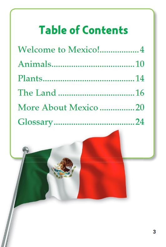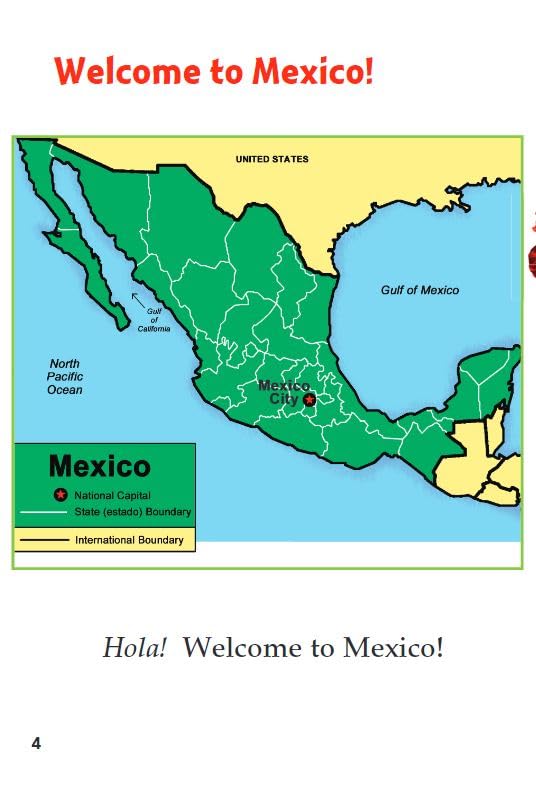 This nonfiction book teaches young readers about the geography, animals, and culture of Mexico using informational text and visuals.