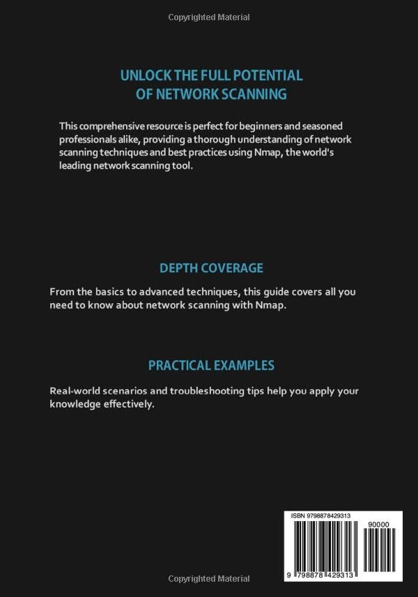 A comprehensive guide takes you on a deep dive into network scanning, from basic commands to advanced techniques, providing all the tools you need to secure and understand your network like a pro. You’re an IT professional, a cybersecurity student, or a curious beginner, Nmap Network Scanning is designed to make complex network scanning techniques accessible and practical. With hands-on examples and step-by-step instructions, this book will equip you with the skills to explore networks safely, identify vulnerabilities, and enhance your cybersecurity expertise. Key Features Complete Guide to Nmap: Learn how to install, configure, and use Nmap on various platforms, with clear instructions and detailed explanations of each feature. Master Nmap Scanning Techniques: Explore different scanning types, including TCP, SYN, UDP, and ICMP scans, and understand when and how to use them effectively. Advanced Options for Power Users: Dive into OS detection, version scanning, the Nmap Scripting Engine (NSE), and other advanced techniques that give you complete control. Practical Network Mapping and Discovery: Discover how to map network topologies, find connected devices, and visualize network data for better understanding and decision-making. Hands-On Security Testing: Learn ethical and legal methods to conduct vulnerability assessments, identify open ports, and detect potential security threats. Automation and Customization: Use Nmap with scripting languages like Python to automate scans, create custom scripts, and streamline your workflow. Real-World Applications: Each chapter is filled with practical examples and case studies, allowing you to apply what you learn to real-world network security tasks. What You Will Learn The fundamentals of network scanning and mapping with Nmap How to run efficient and accurate scans for various network environments Techniques to bypass firewalls and intrusion detection systems responsibly Scripting with NSE to customize Nmap for specific tasks How to integrate Nmap with other cybersecurity tools for comprehensive assessments Practical skills for troubleshooting and optimizing scans Perfect For Cybersecurity Professionals: Boost your skills in network scanning, penetration testing, and vulnerability assessment. IT and Network Administrators: Gain valuable insights into your network infrastructure to strengthen security and manage assets effectively. Students and Learners: A great resource for anyone studying cybersecurity, ethical hacking, or network management. Tech Enthusiasts and Hobbyists: Learn how to explore networks responsibly and gain a deep understanding of network scanning. With this guide you’ll gain the knowledge and confidence to use Nmap effectively in any network environment. Get ready to take your cybersecurity skills to the next level and become a network scanning expert.