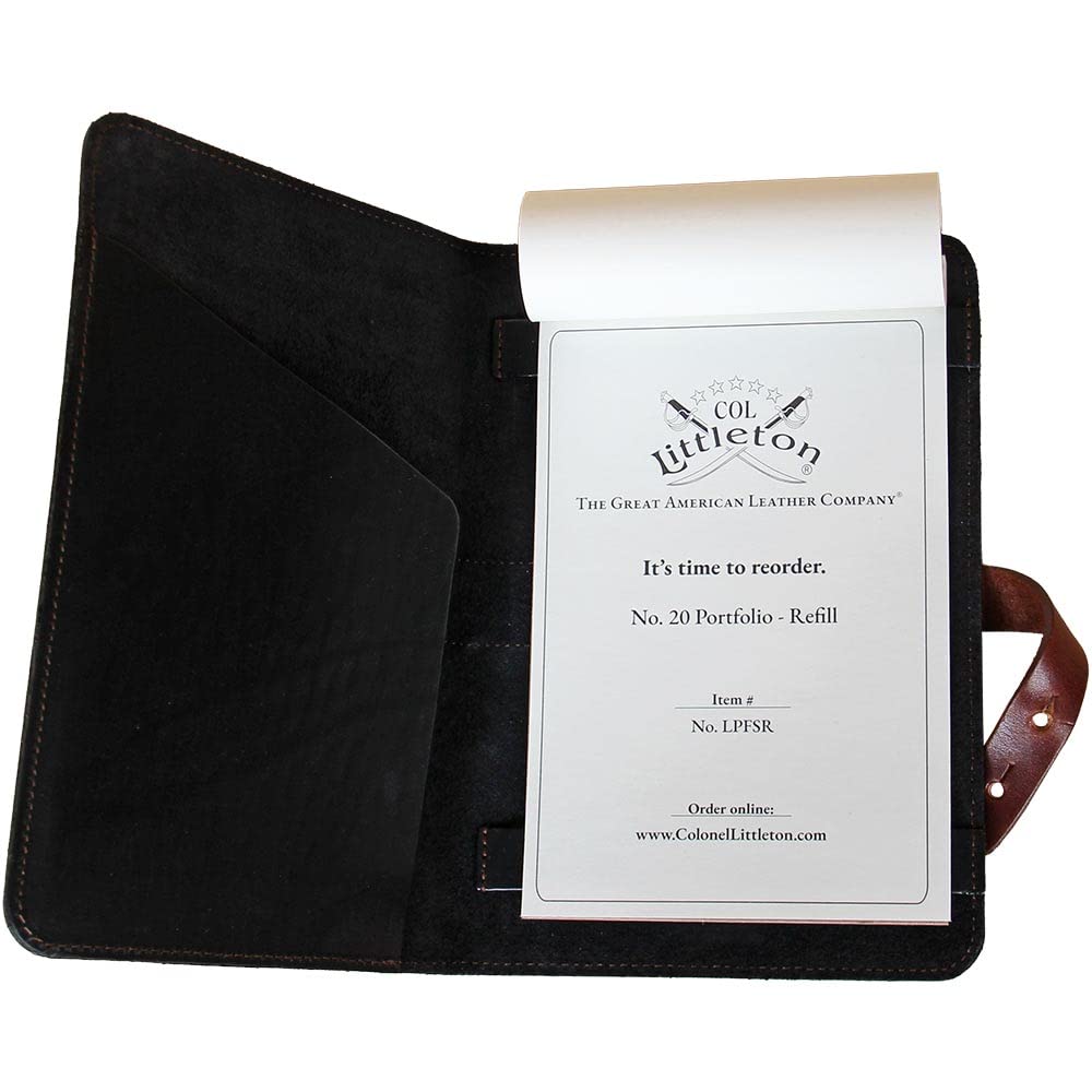 This beautiful, full-grain leather padfolio will upgrade your memory the old-fashioned way. Conveniently sized for travel hither and yon, this little beauty can accompany you on adventures by plane, train, and automobile. It also looks awfully good on your bedside table or out and about on shopping excursions. In today’s fast-paced world, there’s just too much to remember. And, when the brain hits overload, there’s no easy, add-on memory chip solution. I decided an easily transportable travel-size portfolio was just what I needed to jot down ideas or anything else I wanted to remember. Construction & Extras This 6″ X 9″ folder is handmade with full-grain, vegetable-tanned American steerhide, handcrafted in the Col. Littleton workshop in Lynnville, TN with imported hardware. A smaller version of our popular No. 18 Leather Portfolio, this travel size padfolio boasts the same important finishes in a compact size; edge stitched, solid brass 2-position post closure, inside diagonal pocket, accommodates 5″ X 8″ pad, and includes the Colonel’s specially designed Memorandum Pad, USA made. Strap with 2-position solid brass closure, imported. Slash pocket. Memorandum Pad secured with two straps.. Available Refill Option: Memorandum Pad – Set of 6 (USA made)