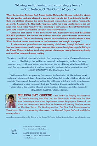 When the two-time National Book Award finalist Melissa Fay Greene confided to friends that she and her husband planned to adopt a four-year-old boy from Bulgaria to add to their four children at home, the news threatened to place her, she writes, “among the greats: the Kennedys, the McCaughey septuplets, the von Trapp family singers, and perhaps even Mrs. Feodor Vassilyev, who, according to the Guinness Book of World Records, gave birth to sixty-nine children in eighteenth-century Russia.” Greene is best known for her books on the civil rights movement and the African HIV/AIDS pandemic. But she and her husband have also pursued a more private vocation: parenthood. “We so loved raising our four children by birth, we didn’t want to stop. When the clock started to run down on the home team, we brought in ringers.” A celebration of parenthood; an ingathering of children, through birth and out of loss and bereavement; a relishing of moments hilarious and enlightening–No Biking in the House Without a Helmet is a loving portrait of a unique twenty-first-century family as it wobbles between disaster and joy.