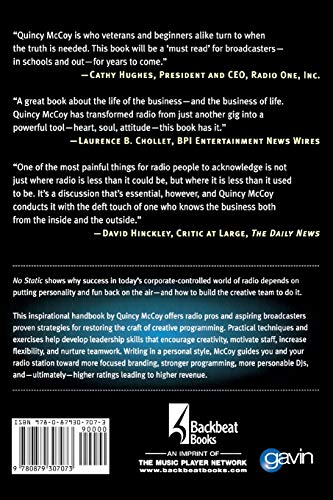 Now in softcover, No Static shows why success in today’s corporate-controlled world of radio depends on putting personality and fun back on the air – and how to build the creative team to do it. This inspirational handbook by Quincy McCoy offers radio pros and aspiring broadcasters proven strategies for restoring the craft of creative programming. Practical techniques and exercises help develop leadership skills that encourage creativity, motivate staff, increase flexibility and nurture teamwork. Writing in a personal style, McCoy guides you and your radio station toward more focused branding, stronger programming, more personable DJs, and – ultimately – higher ratings leading to higher revenue.
