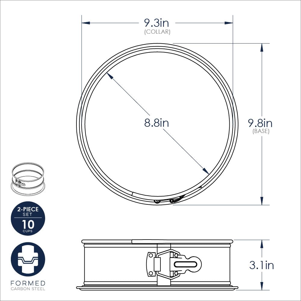 - The pan diameter: base 9.8 inches, collar 9.3 inches and the interior is 8.8 inches. With a 3.1 inch height and 10 cup capacity.