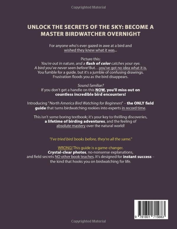 Unlock the Secrets of the Sky: Become a Master Birdwatcher Overnight For anyone who’s ever gazed in awe at a bird and wished they knew what it was… Picture this: You’re out in nature, and a flash of color catches your eye. A bird you’ve never seen before! But…you’ve got no idea what it is. You fumble for a guide, but it’s a jumble of confusing drawings. Frustration floods you as the bird disappears. Sound familiar? If you don’t get a handle on this NOW, you’ll miss out on countless incredible bird encounters! Introducing “North America Bird Watching for Beginners” – the ONLY field guide that turns birdwatching rookies into experts in record time. This isn’t some boring textbook; it’s your key to thrilling discoveries, a lifetime of birding adventures, and the feeling of absolute mastery over the natural world! Inside this book, you’ll learn: How to ID any bird like a seasoned pro – even if it’s just gone in a flash! The sneaky tricks birds use to hide – and how to outsmart them every time Secret spots where the most amazing birds hang out (hint: some are closer than you think) The REAL way to attract birds to your own yard – those cheap feeders aren’t doing squat Birding like Sherlock Holmes: How to decode songs, calls, and behaviors How to spot owls, hawks, and other elusive creatures most guides ignore Simple tweaks to make your photos jaw-dropping (you won’t believe the difference!) “I’ve tried bird books before, they’re all the same.” WRONG! This guide is a game-changer. Crystal-clear photos, no-nonsense explanations, and field secrets NO other book teaches. It’s designed for instant success – the kind that hooks you on birdwatching for life. Ready for a birding revolution? Grab your copy of “North America Bird Watching for Beginners” today. The birds are waiting. Your adventure starts NOW!