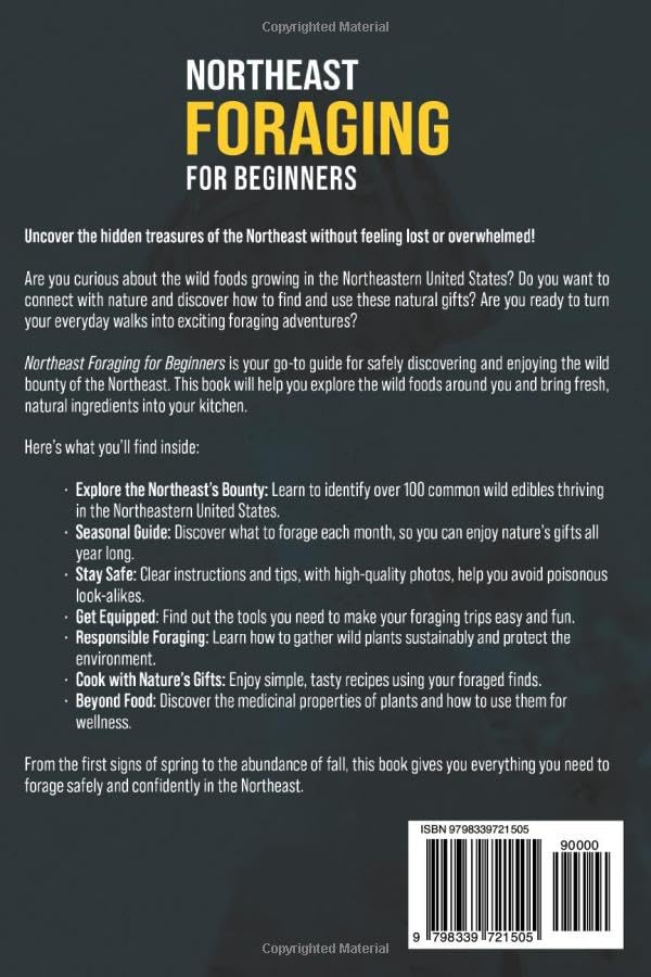Unlock the Secrets to Finding, Identifying, and Harvesting Wild Foods in the Northeast–With Simple Tips and Full-Color Photos! Are you curious about the wild plants growing in the Northeast? Do you want to explore nature and find out how to use these natural treasures? This book will help you safely discover wild foods and bring fresh, natural ingredients into your kitchen. Northeast Foraging for Beginners makes it easy to find and enjoy wild plants all year round. Here’s what you’ll find inside: Learn to identify the most common wild edibles growing in the Northeastern United States. Southeast Foraging Calendar to help you know what to find in each season. 60+ full-color pictures to help you recognize plants easily. Tips to stay safe and avoid poisonous look-alikes. Find out what tools you need to make foraging easy and fun. Simple recipes to cook with the plants you find. Learn how to forage responsibly and protect the environment. Discover the medicinal uses of plants for natural health. And so much more! Why This Book? This book is perfect for anyone who loves nature and wants to get started with foraging. It gives you easy-to-follow instructions so you can confidently identify, gather, and use wild plants. The full-color pictures and foraging calendar make it simple to find the right plants at the right time of year. Whether you’re new to foraging or just looking for more information, this guide helps you stay safe, enjoy nature, and bring fresh, healthy ingredients into your life. It’s a great way to connect with nature and discover the hidden treasures of the Northeast. This book has everything you need to forage with confidence and bring nature’s gifts into your life. Click “Add to Cart” now and start your foraging adventure today!