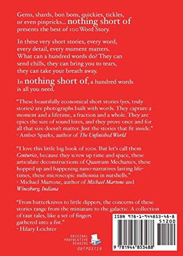 Gems, shards, bon bons, quickies, nuggets, tickles, or even pinpricks. Each 100 Word Story is its own kind of special. NOTHING SHORT OF presents the best of 100WordStory.org, the leader in short-short fiction and a popular go-to for great reading.In these very short stories, every word, every detail, every moment matters. And the things left out, the spaces around the stories, are just as intense. What can a hundred words do? They can send chills, they can bring you to tears, they can take your breath away. In charged, sometimes racy encounters — from wild, messy breakups to a disgruntled clown dinner to quiet revelations over folded laundry — these 100-word stories take us to lightning moments when everything is at stake.
