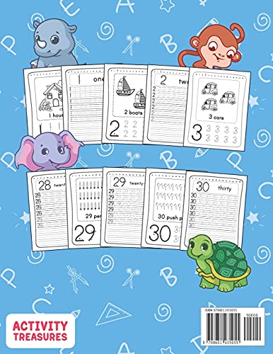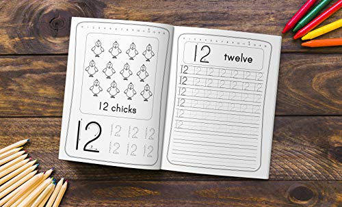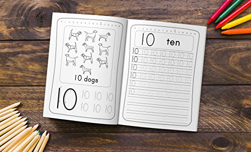 This workbook helps young children develop number recognition, counting, and fine motor skills through tracing exercises.