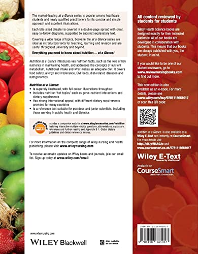 Nutrition at a Glance introduces key nutrition facts, such as the role of key nutrients in maintaining health, and addresses the concepts of nutrient metabolism, nutritional intake and what makes an adequate diet. It covers food safety, allergy and intolerance, GM foods, diet-related diseases and nutrigenomics. Nutrition at a Glance: * Is superbly illustrated, with full colour illustrations throughout * Includes nutrition ‘hot topics’ such as gene-nutrient interactions and dietary supplements * Has strong international appeal, with different dietary requirements provided for many countries * Is a reference text suitable for post-docs and junior scientists, including those working in public health and dietetics * Includes a companion website at www.ataglanceseries.com/nutrition featuring interactive multiple choice questions, abbreviations, a glossary, references and further reading, and Appendix B 1: Global dietary guidelines and Dietary Reference Intakes