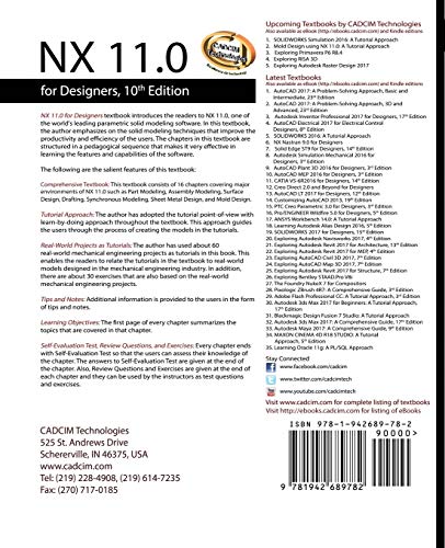 NX 11.0 for Designers is a comprehensive textbook that introduces the users to feature based 3D parametric solid modeling using the NX 11.0 software. The textbook covers all major environments of NX with a thorough explanation of all tools, options, and their applications to create real-world products. In this textbook, about 39 mechanical engineering industry examples are used as tutorials and an additional 34 as exercises to ensure that the users can relate their knowledge and understand the design techniques used in the industry to design a product. After reading the textbook, the user will be able to create parts, assemblies, drawing views with bill of materials, and learn the editing techniques that are essential to make a successful design. Also, in this book, the author emphasizes on the solid modeling techniques that improve the productivity and efficiency of the user.Keeping in mind the requirements of the users, the textbook at first introduces sketching and part modeling in NX 11.0, and then gradually progresses to cover assembly and drafting. In addition, a chapter on mold design for plastic components has been added in this textbook. Written with the tutorial point of view and the learn-by-doing theme, the textbook caters to the needs of both novice and advanced users of NX 11.0 and is ideally suited for learning at your convenience and pace.