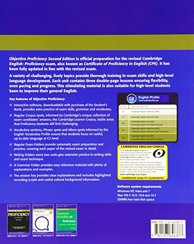 Objective Proficiency Second edition provides Official Exam Preparation for Cambridge C2 Proficiency. Everything you need to be confident for exam day. A variety of challenging, lively topics provide thorough training in exam skills and high-level language development. Each unit contains three double-page lessons ensuring flexibility, even pacing and progress. Interactive software, downloadable from a URL in the Student’s Book, provides activities for practice of exam skills, grammar and vocabulary. (Mac users must pre-install Adobe Air and Java in order to run this software). Exercises and examples tackle areas that Proficiency students often find challenging. Audio for the Student’s Book listening exercises is available as part of a separate Student’s Book Pack, or separately. A Student’s Book without answers is also available.